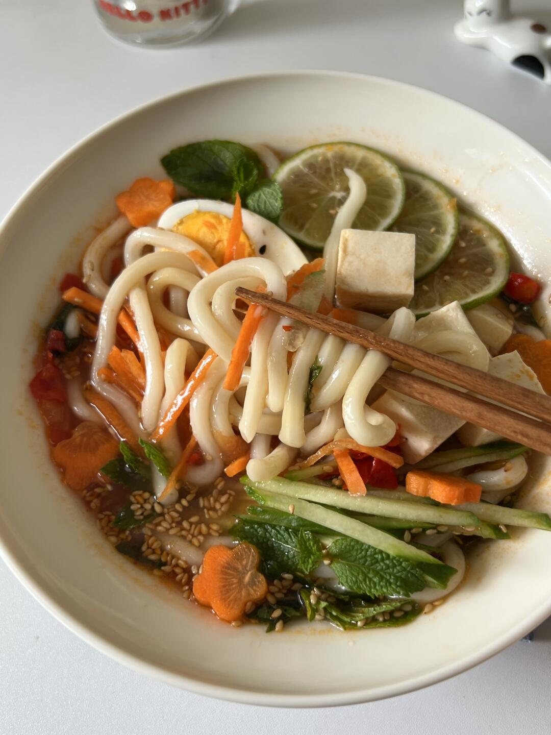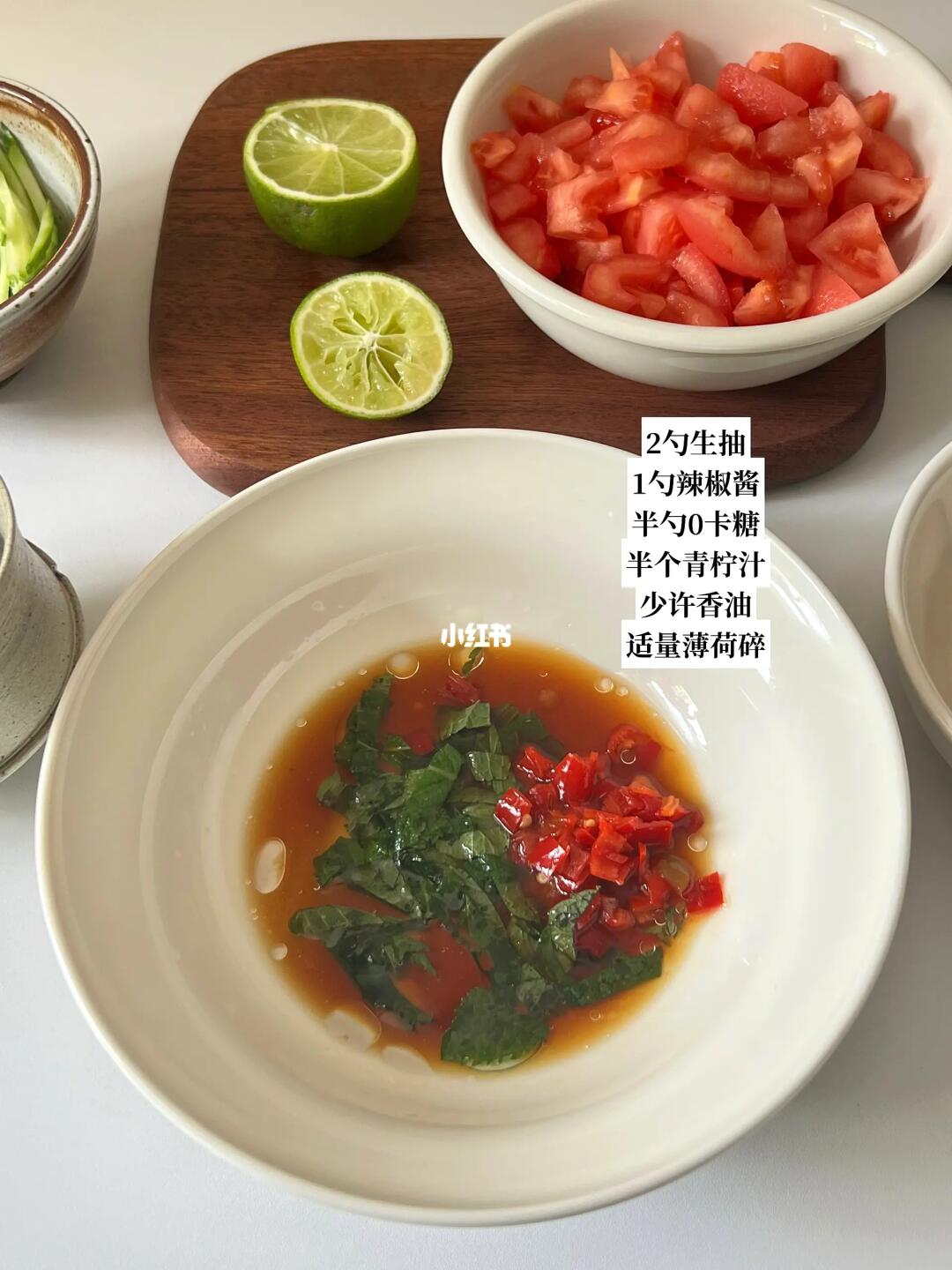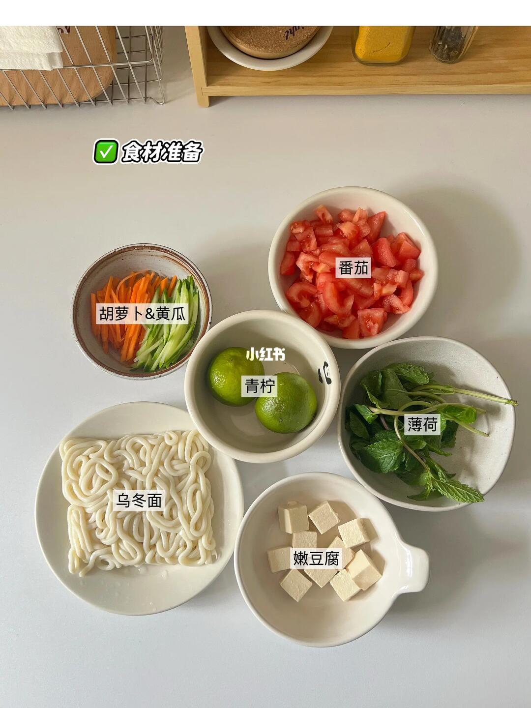 🥕 食材:乌冬面、豆腐、胡萝卜、黄瓜、青柠、薄荷、番茄、鸡蛋