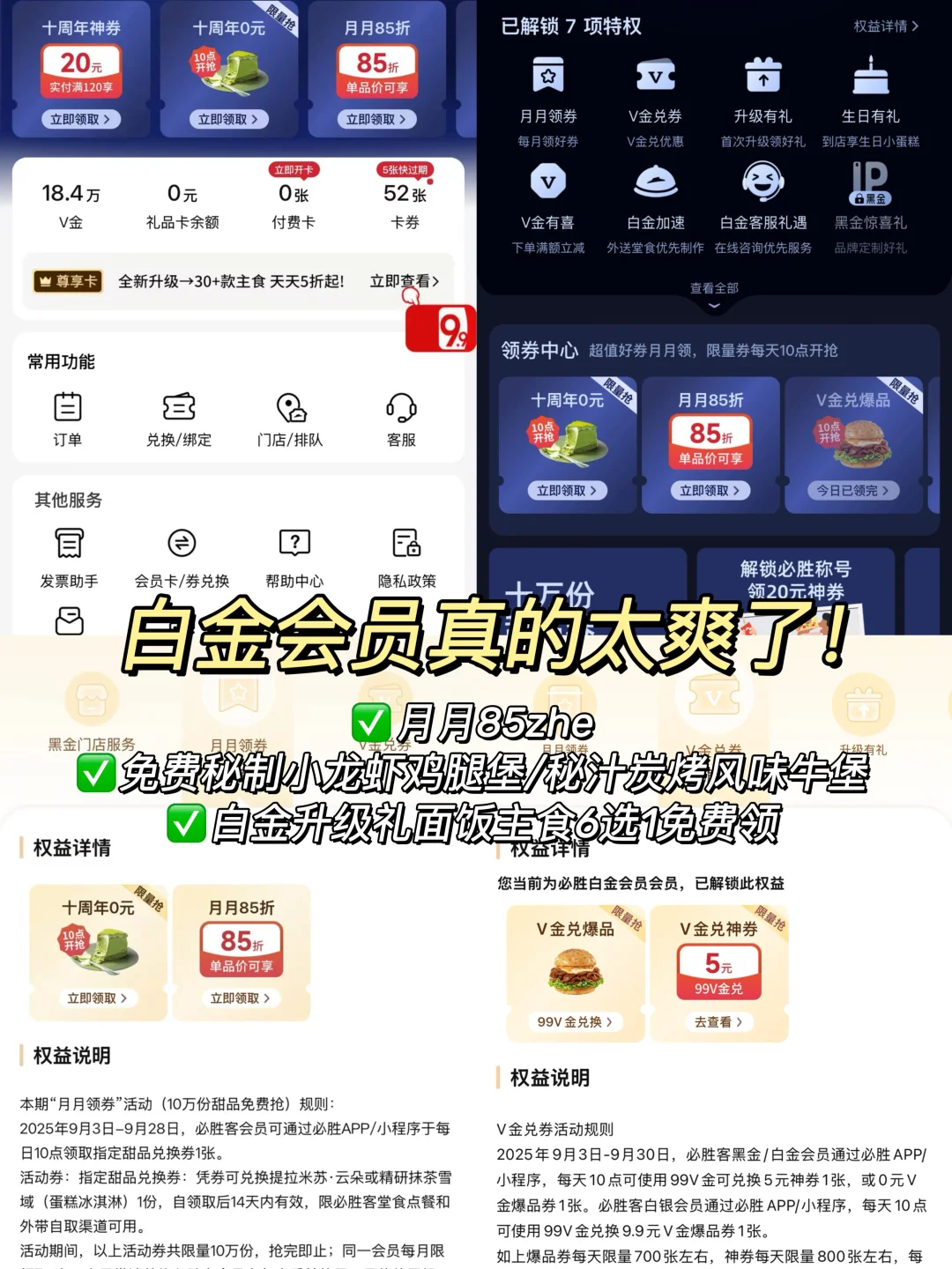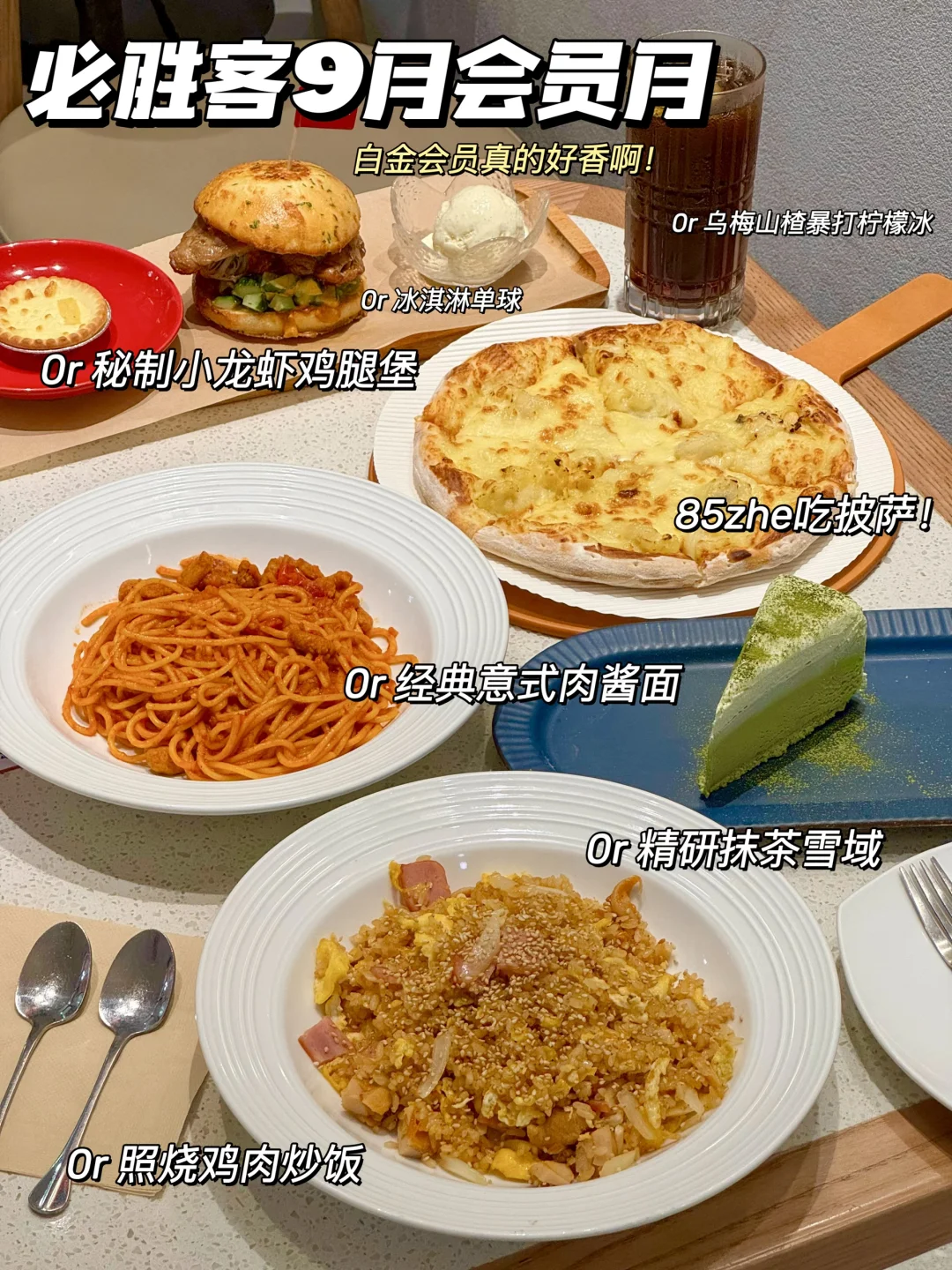 必胜客太宠我们了啊! 是谁还不是必胜客白金会员的! 🆓的小龙虾鸡腿堡!🆓的面饭🍜!🆓的甜品!除了🆓0r吃之外 还有好多⭕️!还能提前出餐😭 📣9月会员限时攻略整理好了看这里! ✅ 每月领85zhe⭕️ 85zhe吃披萨🍕太爽了!点了我坠爱❤️的金枕榴莲多多披萨 大块的金枕头榴莲果肉多到pu出来…软糯香甜芝士味道敲浓郁🤤 ✅黑金白金 v金兑0r汉堡 任选1个秘制小龙虾鸡腿堡或秘汁炭烤风味牛堡 9月8日限时回归的小龙虾鸡腿堡🦞啊!大块多汁的鸡腿排和Q弹的手剥龙虾 搭配外酥里软的比萨面包😭太好吃了吧! ✅ 白金升级🎁 0r🉐一个餐品 3只新奥尔良香骨鸡、乌梅山楂暴打柠檬冰、冰激凌单球、经典意式肉酱面、照烧鸡肉炒饭、新奥尔良式鸡肉意面 任选一个都可以!!🆓的就是香🤤 ✅9月会员月🆓甜品 下午茶来必胜客 吃🆓的提拉米苏·云朵蛋糕或精研抹茶雪域 会员都有😭