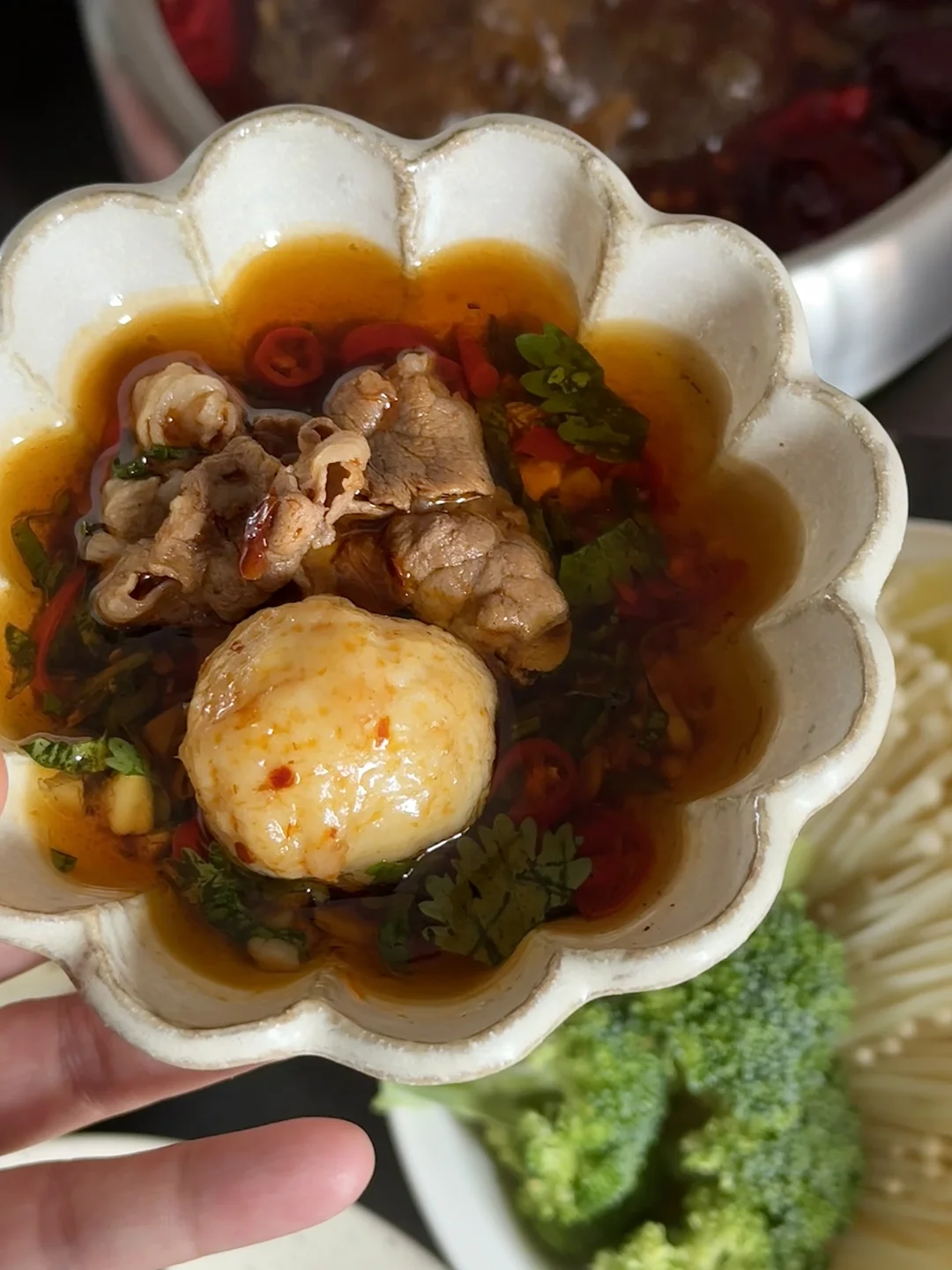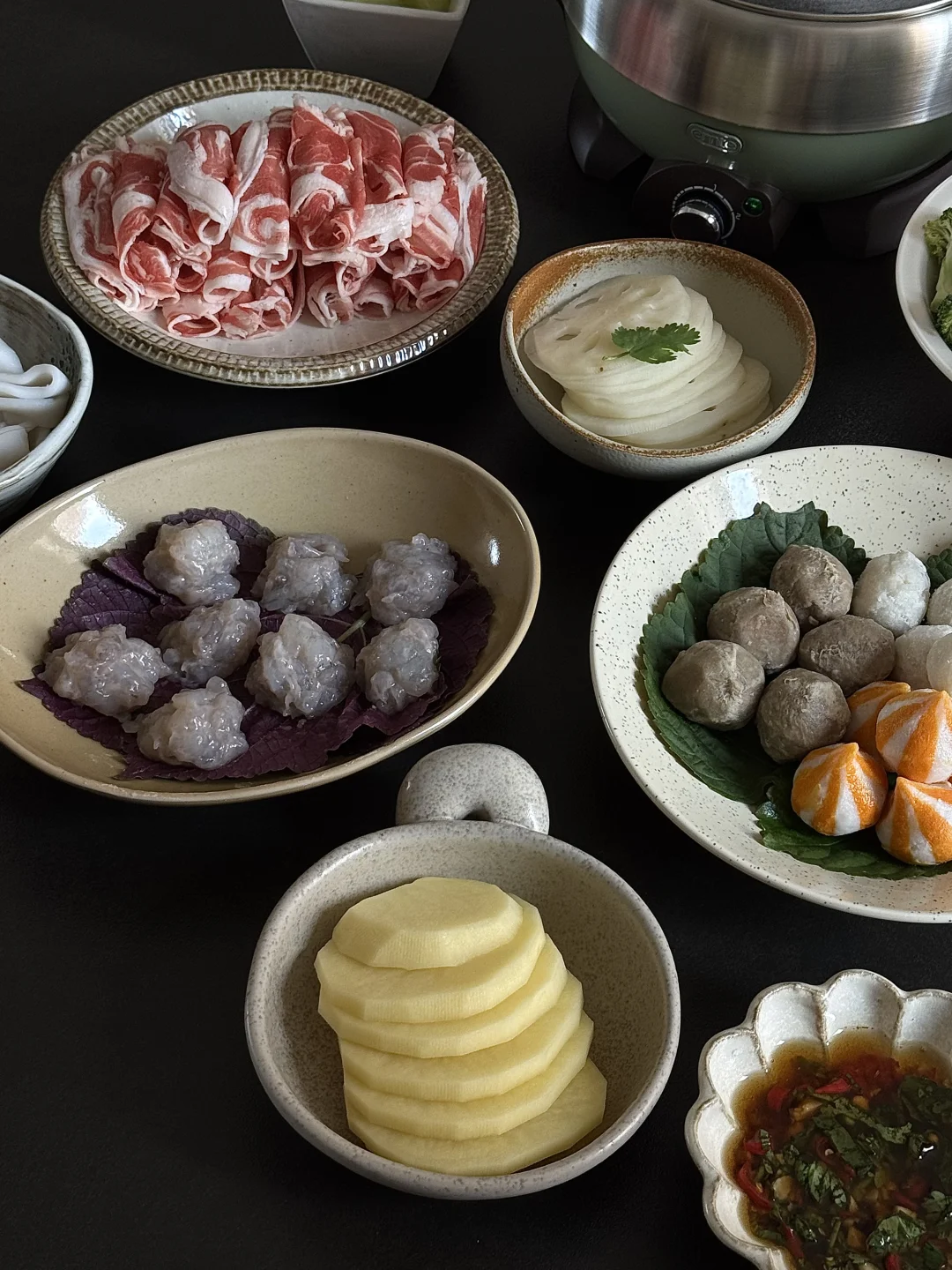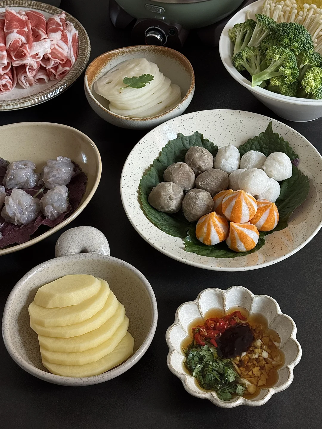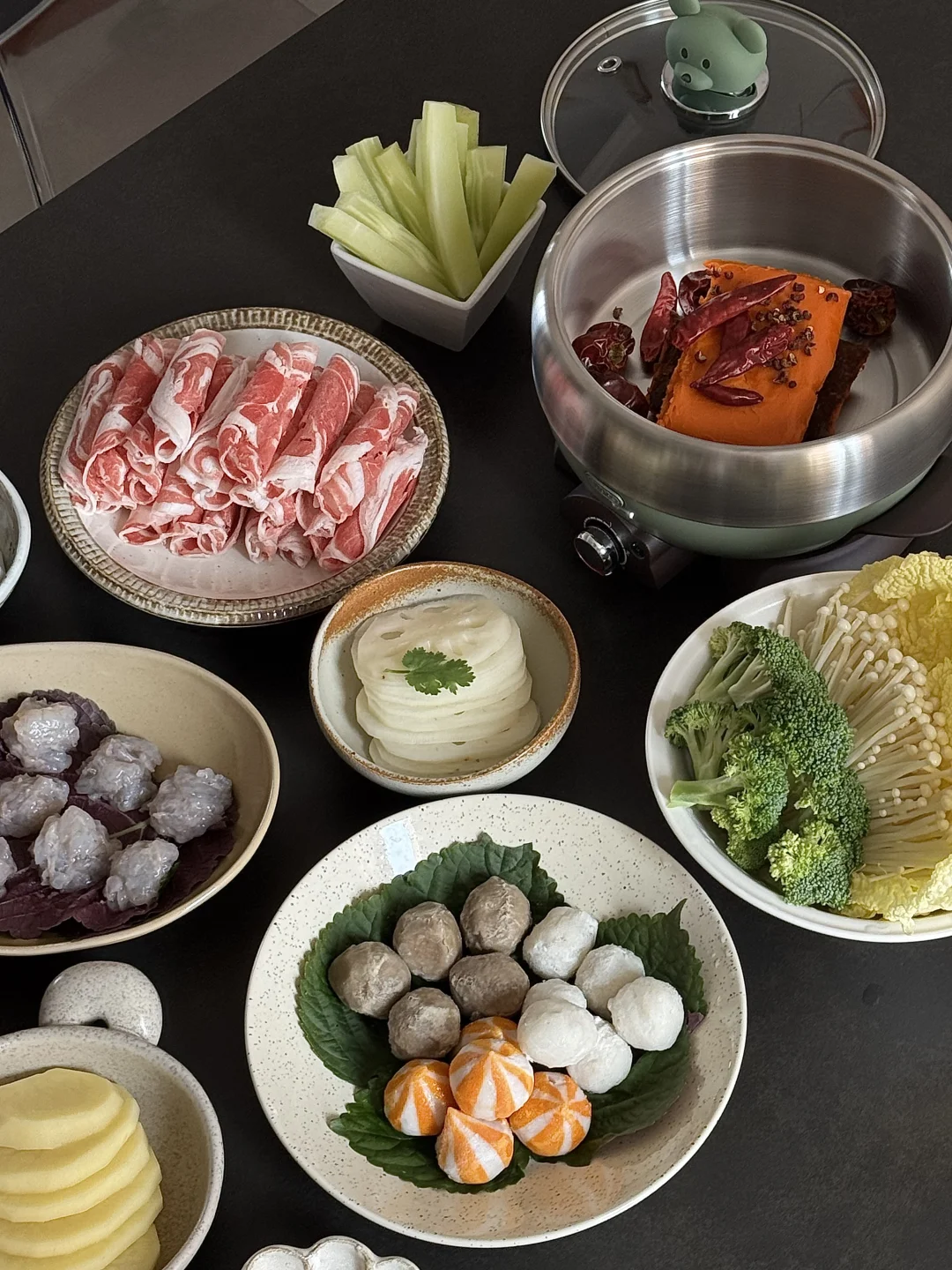 - 阴雨天🌧️和麻辣火锅的适配度💯 在家吃火锅的好处就是 喜欢什么就准备什么[萌萌哒R] 比如我最爱的厚切土豆片! 和大颗粒的虾滑以及鱼丸[吧唧R] - 🥘火锅食材: 羔羊卷🥩 虾滑🦐 丸子三拼🍡 薄切藕片 土豆片🥔 西兰花🥦 金针菇 娃娃菜🥬 宽粉 青笋 - 🥣香香油碟: 蒜末➕小米辣➕香菜➕蚝油➕醋➕香油 - 没有什么是一顿火锅解决不了的 如果有!那就两顿[萌萌哒R] 宝们一定要好好吃饭🍚 生活会奖励每一个大口吃饭的人[吃瓜R]