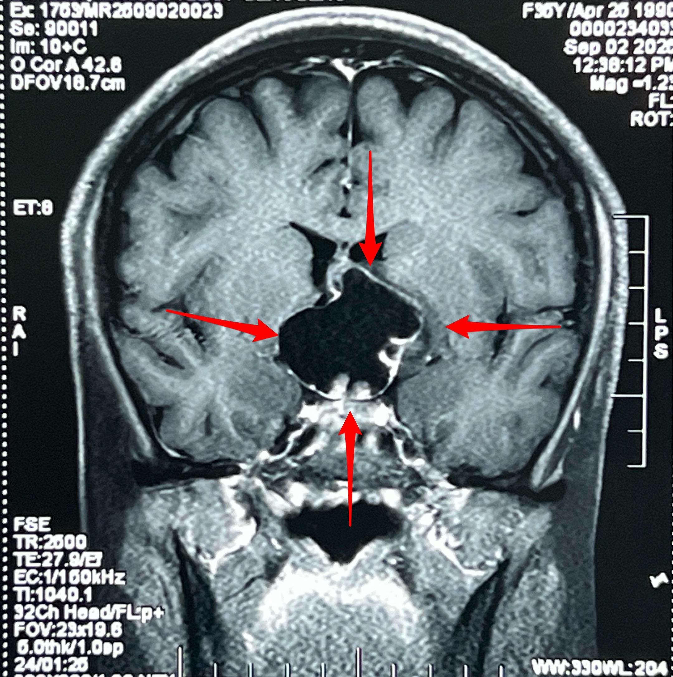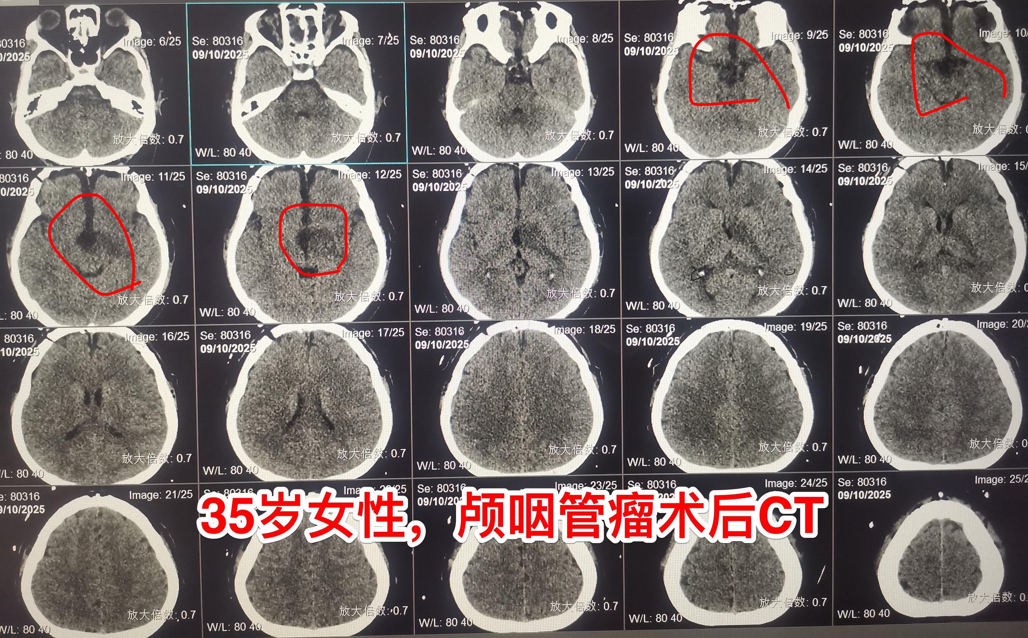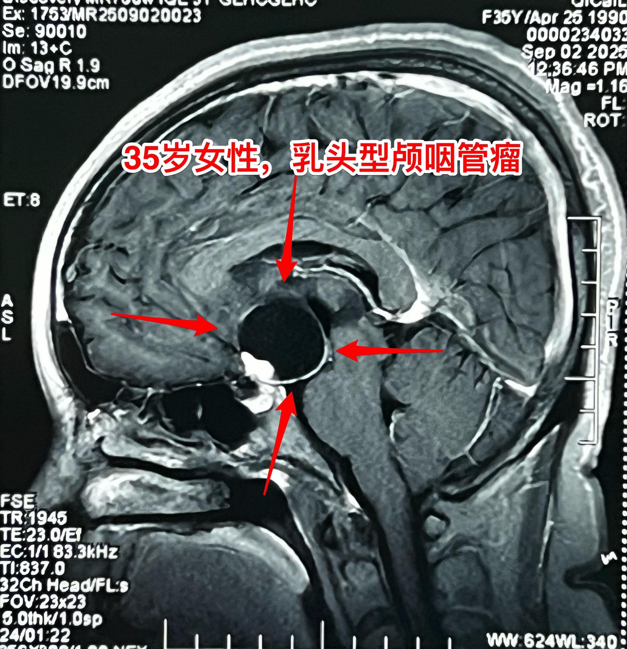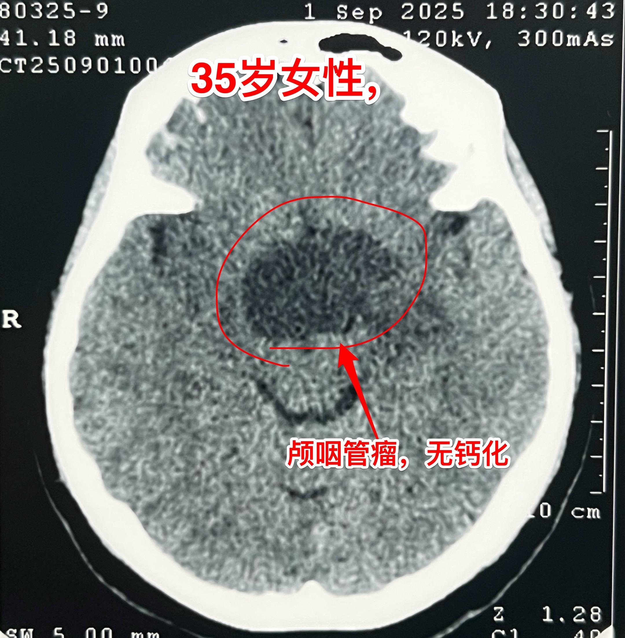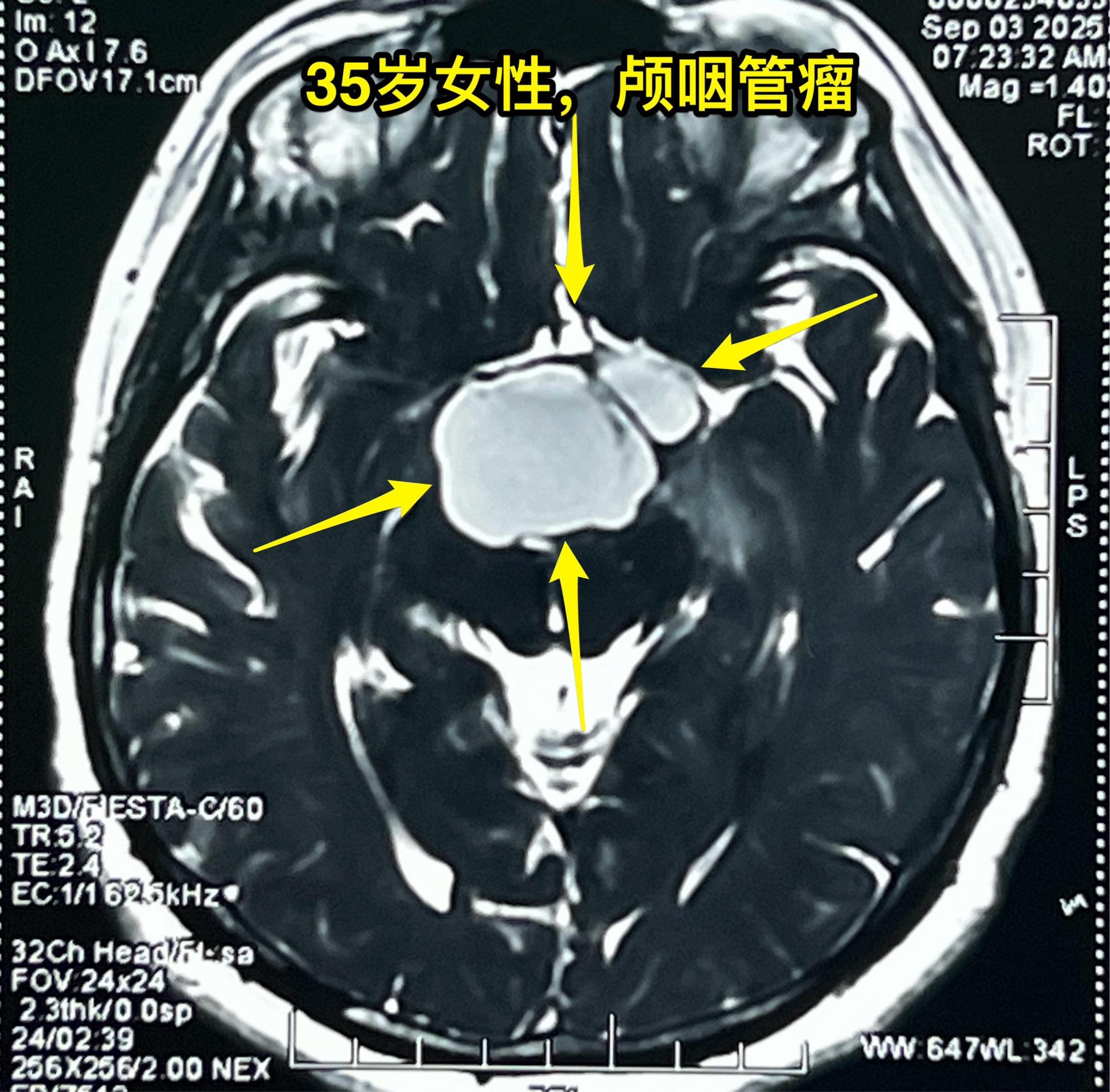 颅咽管瘤的症状科普。之前我多次讲过颅咽管瘤的症状,结合这个病人再说一次。 这个35岁女性在2025年8月发现了颅咽管瘤。 她两年前最开始出现生理周期紊乱、停经,这是下丘脑-垂体受损伤导致的内分泌系统功能障碍的表现。 一年前患者出现视力下降,越来越严重,一直到没有有效视力了才去就医,才发现这个颅咽管瘤。这是视神经-视交叉受到肿瘤压迫造成的。 在视力下降的同时病人出现长胖,体重显著增加。这也是下丘脑受损的表现。 病人在就诊