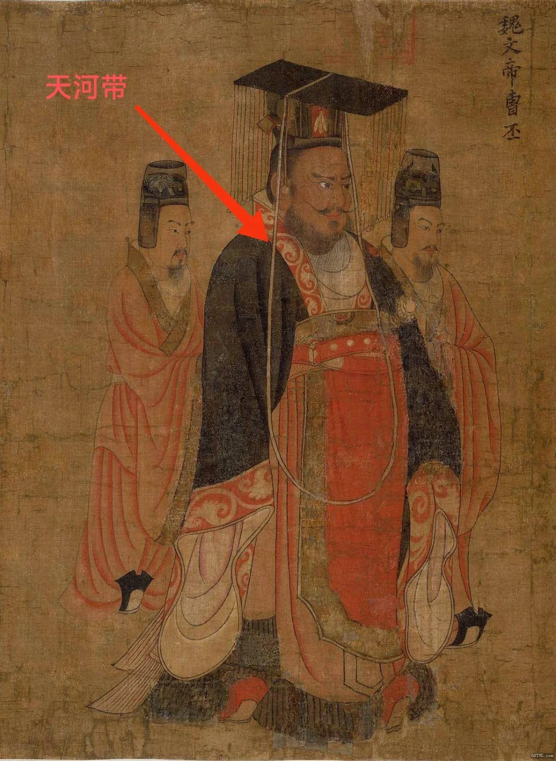 [六R]唐代以后,冠纮加长,上横于冕板,下垂绕于胸前,名曰“天河带”。