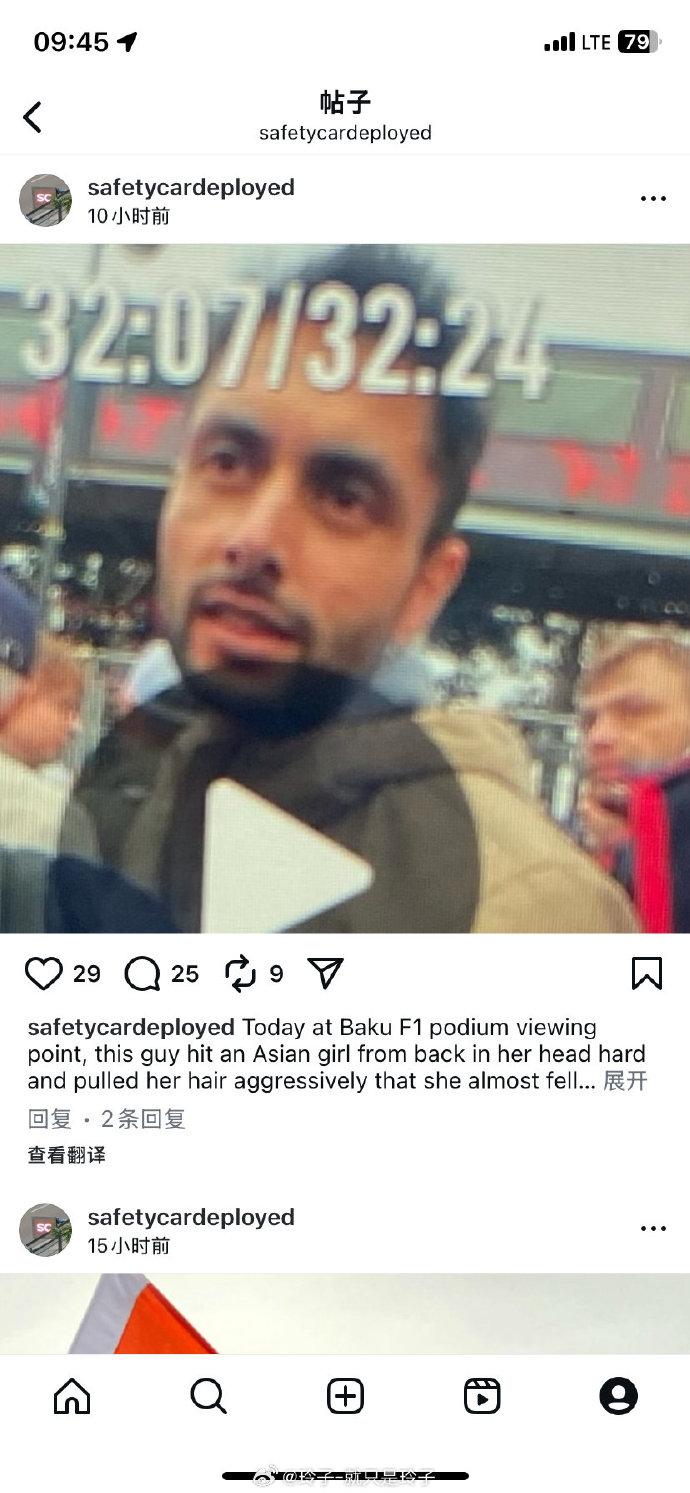 她表示:向赛会保安报告后,保安安慰我说现场有那么多安保摄像头一定能找到人,帮我询问负责人后,却告知很遗憾只能让我自行向BakuCityCircuit报告。随后自己感觉头有点晕担心脑震荡,原地坐了半小时。自己走去最近的InfoCenter,工作人员完全没有任何报警/救助的应对措施,我只好继续询问医疗点在哪。最后自己找到医务人员,医务人员在并没有进行任何检查的情况下提供了大剂量布洛芬。