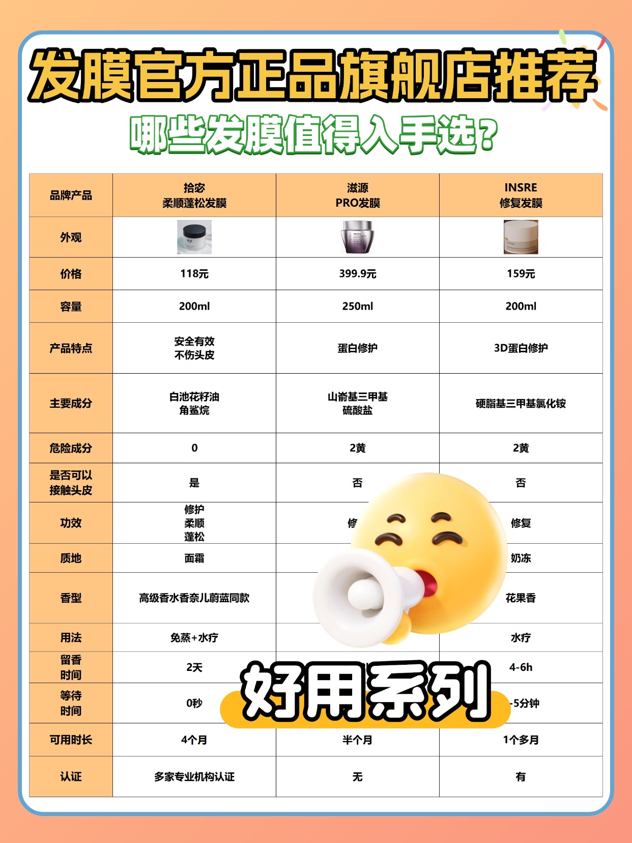 平时总有人问发膜多久用一次,这里统一跟大家说,正常发质一周 1 次就够了,干枯受损发质可以一周 2 次,油性头皮建议减少频率,只涂发中发尾,避免头皮更油,还有人问发膜抹完要吹干吗,其实抹完发膜需要停留几分钟让营养吸收,然后一定要用清水彻底冲洗干净,冲洗完可以用毛巾按压吸水,再正常吹干头发,不冲洗干净会让头发黏腻、扁塌、甚至起头皮屑,我做测评只看真实使用感和成分合理性,不偏向任何一款产品,下面是我总结的一些发膜选购注意事项,干货满满,可以先赞收藏。