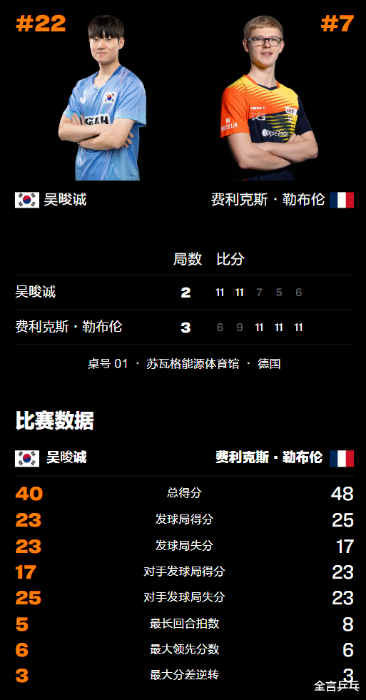 吴晙诚与小勒布伦同岁,曾在去年亚锦赛上打败王楚钦等人拿到男单铜牌,不过在各方面都难以与小勒布伦争雄,过去两次交手都是2-4落败,但这次在法兰克福的表现可圈可点。