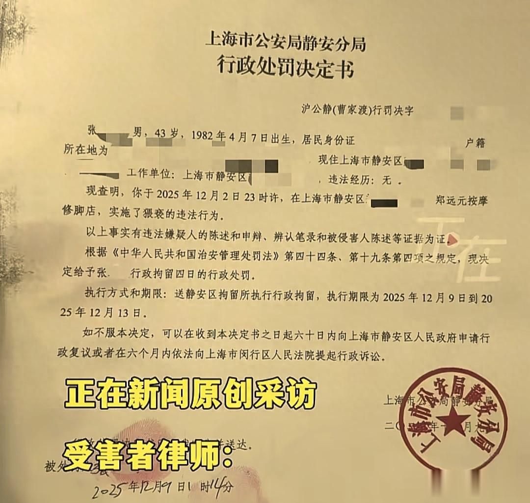 事情得从2025年12月2号晚上11点多说起,上海一位姓刘的女士去郑远元修脚店做肩背按摩,她进了包间,由一名43岁的男技师张某接待,没过多久,张某突然动手扯掉她的衣服并触碰隐私部位,刘女士当场喊停并报警,第二天警方作出处罚决定,张某因猥亵行为被行政拘留4天。