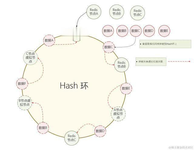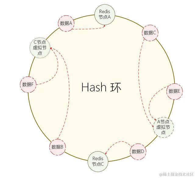 S1 : 为每个物理节点生成多个虚拟节点,并且让所有的节点都均匀的分布在 Hash 环上面S2 : 当数据操作请求进来时 , 如果指向了虚拟节点,就映射到实际的物理节点中通过这样的方式,就可以保证数据的相对均衡。 当然,这种均衡还是相对的。