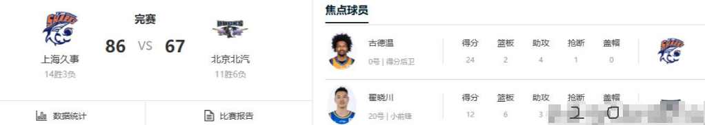 北京首钢67:86上海久事。本场比赛,北京男篮多名主力无法登场,不过球队上半场表现十分顽强,结束时居然取得领先。但第三节,上海男篮小外援古德温突然发力,一己之力将比分拉开。此役古德温得到24分、4次助攻,怀特塞德贡献16分、14个篮板、3次盖帽,洛夫顿拿下11分;北京男篮这边,贝利得到15分,杰曼贡献14分,翟晓川拿下12分,其余球员得分均未上双。