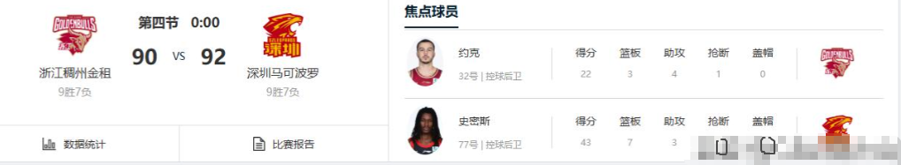 深圳马可波罗92:90绝杀浙江稠州金租。本场比赛是本轮最精彩的一场对决,约克在最后时刻投中关键三分,帮助浙江稠州金租以90:89反超深圳。然而深圳男篮的最后一次进攻中,小外援史密斯直接命中一记绝杀三分,最终以92:90战胜浙江。全场比赛,约克得到22分;深圳男篮这边,史密斯砍下43分、7个篮板、3次助攻的超级数据。