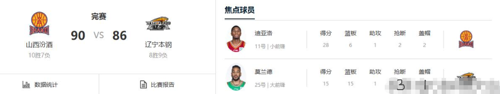 辽宁本钢86:90山西汾酒股份。本场比赛,客场作战的辽宁男篮打得十分顽强,与山西男篮鏖战至最后时刻,无奈球队仅有两名外援出战,最终遗憾落败。全场比赛,山西队外援迪亚洛得到28分、6个篮板、2次抢断、2个盖帽,内线外援奈特贡献19分、6个篮板,法耶拿下12分、10个篮板;反观辽宁男篮,发挥最佳的莫兰德斩获15分、15个篮板(其中包含8个前场篮板)、3次抢断、1次盖帽,威尔斯空砍25分、6个篮板,赵继伟得到15分、6个篮板、7次助攻。