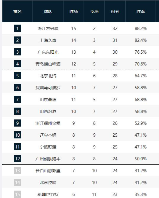 本轮比赛结束后,积分榜发生较大变动:赢球的上海久事反超广东男篮升至第二位,输球的北京首钢仍稳居第五位,获胜的山西汾酒股份来到第七位,近期取得连胜的深圳马可波罗升至第九位,辽宁本钢位居第十位。