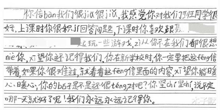 于是,教室里的小脑袋们纷纷拿起笔,用歪歪扭扭的字迹、夹杂着拼音的文字,给这位“转学”的同学写下一封封信。