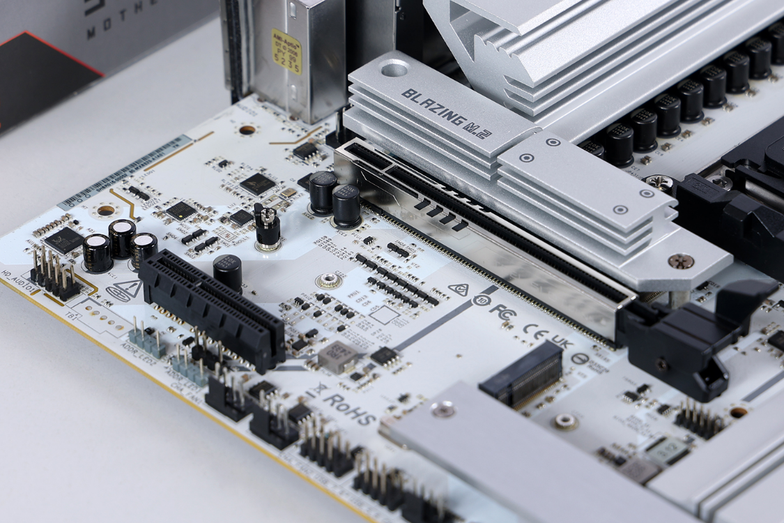 主板提供2条PCIe插槽,近CPU侧的PCIe插槽为X16规格的全长插槽,且最高支持PCIe 5.0 x16的传输速率,插槽外部配备了金属装甲进行加固,插槽卡扣的边角处还设计了一块便于解锁卡扣的把手,十分贴心。靠近主板底部的PCIe插槽则为X4规格的插槽,且最高支持PCIe 4.0 x4的传输速率,但该插槽采用了开放式插槽设计,可以兼容安装物理规格为X8的PCIe设备(受限于第三条M.2硬盘马甲的长度,无法兼容安装X16规格的PCIe设备)。