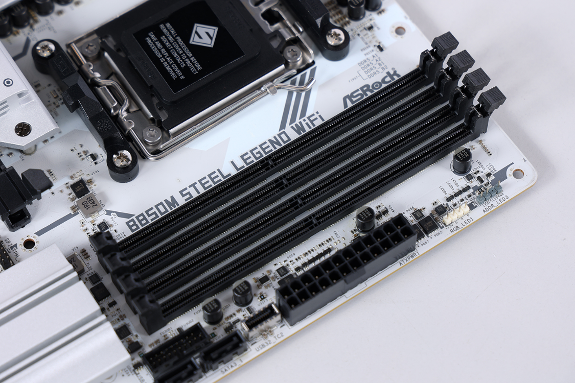 4条采用单边卡扣设计的DDR5内存插槽,最高支持8000+MHz的内存频率,最大支持256G的内存容量。
