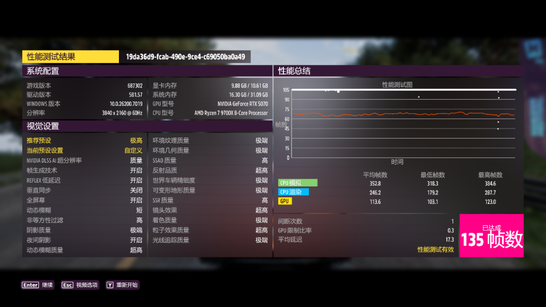 《极限竞速·地平线5》测试,极端画质,极端光追,开启DLSS 3.0,4K分辨率下,DLSS为超高性能模式时,游戏平均帧数161 FPS,DLSS为质量模式时,游戏平均帧数135 FPS;