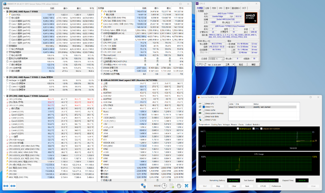 单烤FPU基准测试,手动PBO,烤机测试中,CPU外壳温度为95°左右,CPU封装功耗150W左右;