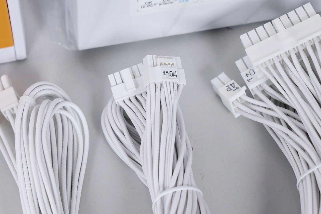 配件方面,电源提供了1根24Pin主板供电线、1根一分二 4+4Pin处理器供电线、1根12V-2x6显卡电源供电线、2根6+2Pin显卡供电线(其中1根为一分二设计)、2根大4D+SATA混合供电线、1根220v C13 AC电源外接供电线以及几根扎带和电源固定螺丝。所有线材均采用白色压纹线,端子也是白色,视觉效果更好。线材质地柔软,玩家装机理线也更便捷。原生12V-2X6电源接口与供电线材,最高可提供单线450W功率的持续输出。
