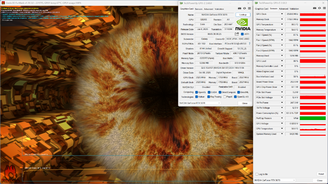 FurMark烤机测试,烤机10 Min后,显卡温度为67°左右,显卡功耗为250W左右;