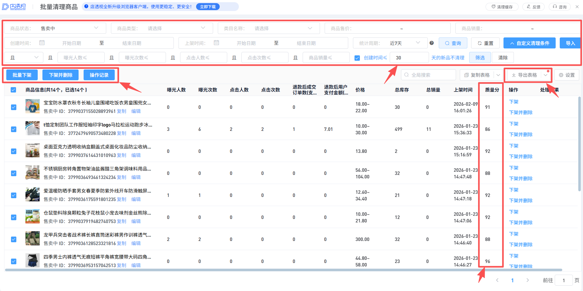 功能层级核心作用关键操作与价值第一层:圈定范围多维度初步筛选可按商品状态、类目、上架时间(如“>60天”)、销量(如“=0”)组合筛选,快速定位疑似问题商品池。第二层:数据诊断核心表现深度洞察对接店铺后台数据,支持按曝光量、点击量、订单数等硬性指标(如“曝光≤50且订单=0”)精准定位“僵尸商品”。内置的质量分(综合标题、主图、评价等维度)提供直观的全局健康度参考。第三层:安全防护规避误操作风险默认“30天内新品不清理”,充分保护商品冷启动期,防止误杀潜力款。支持自定义保护时间,满足个性化运营节奏。第四层:批量执行高效释放人力支持一键“批量下架”或“下架并删除”,所有操作记录可追溯、可导出,便于复盘与审计。