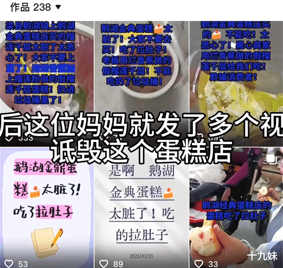 可能是见网友的关注度不高,她又接连发布5条视频,捏造的“黑料”越来越离谱:一会儿说孩子吃了蛋糕“上吐下泻”,一会儿指控店家“用烂香蕉冒充榴莲做千层”,甚至直呼其为“黑心商家”,并“忠告”网友一定要“避雷”,暗示大家一起抵制。