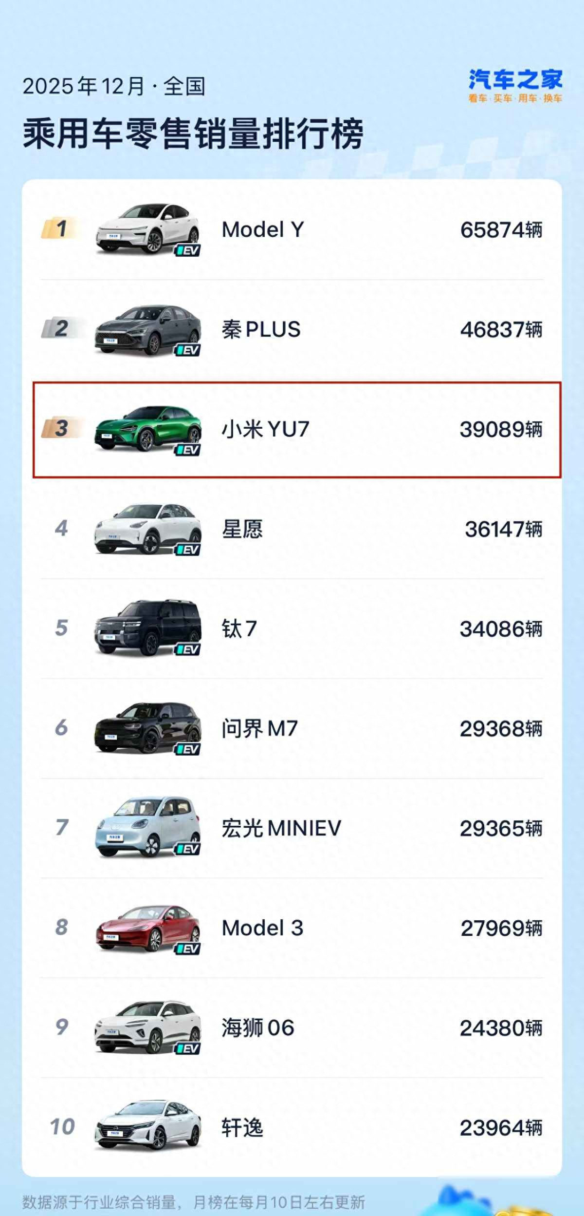 2026年1月,YU7卖出了37869台车,成为全国乘用车销量第一名,它超过了吉利博越L和星愿这两款车型,连特斯拉Model Y也掉到了第20名的位置,不过很多人没有留意到,这个第一名并不是突然冒出来的,因为SU7在同年2月正式停产了,之前总共交付了38万多台车,现在小米汽车在售的新车型只剩下YU7这一个型号,用户如果想买小米的电动车,就只能选择它。