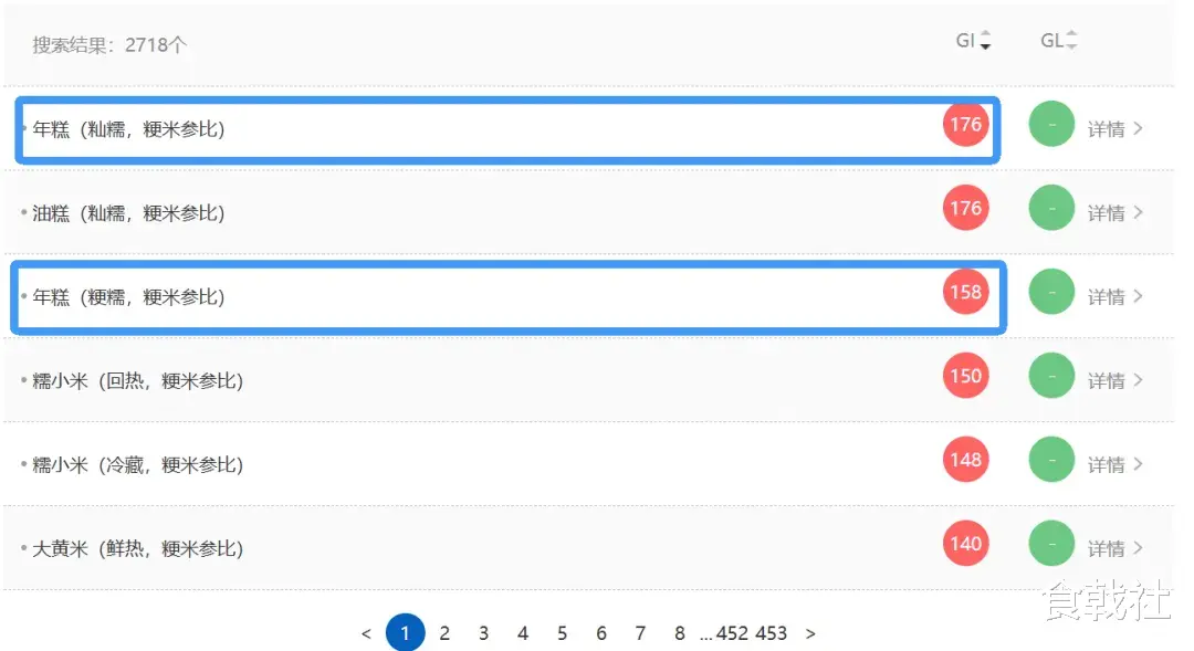 年糕主要由糯米制成,其中的淀粉非常容易被消化吸收,导致餐后血糖迅速升高。对于需要控制血糖的朋友来说,这确实是个挑战。在中国食品发酵工业研究 GI 营养工作室 2718 种食物中,年糕的升糖指数(GI,数值越高,升糖速度越快)名列前茅,比葡萄糖(GI 为 100)还要高。