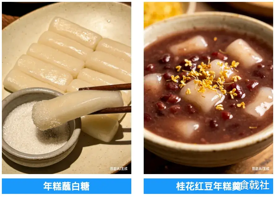 年糕的糯性,也让它天然适合做成甜口。切片煎至两面微黄,趁热蘸上一点白砂糖,外脆里糯,是很多人童年最简单的甜食记忆;或是做成桂花红豆年糕羹,软糯温热,更适合在寒冷的冬天食用。