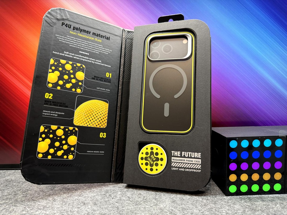 这款手机壳的核心优势,在于融入了应用于防弹衣内衬、高危运动护具的P4U非牛顿流体高分子材料。