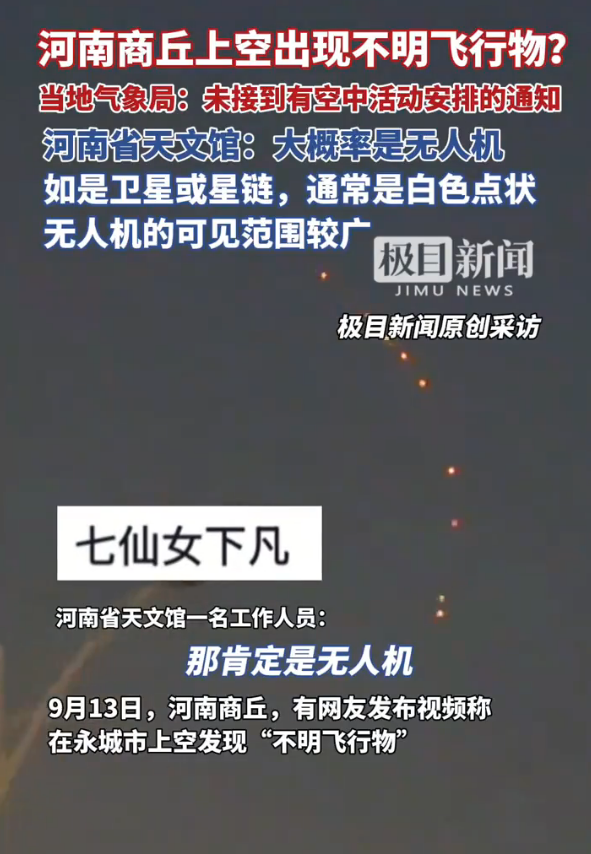 没过几天,河南商丘的夜空又出现诡异一幕:两排共十几个红色光点,整齐排列,静止悬停在空中,持续约半分钟后突然全部熄灭,凭空消失。