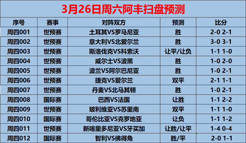 看法:本场数据给了意大利1.5球的支持,双方在近几年都未曾交手。意大利未能直接晋级确实可惜,不过球队整体实力仍然很有保障。效力于五大联赛的常规主力悉数落位,唯一疑问便是巴斯托尼能否登场。北爱尔兰整体实力还是相对有限,面对劲旅时硬仗能力还是较弱,巴拉德的因伤缺席对于球队影响不小,其余效力五大联赛的球员也都全部到位。此番两队交锋,实力更加强劲的意大利仍然是更值得被看好的一方。方向:胜,比分:3-0 3-1