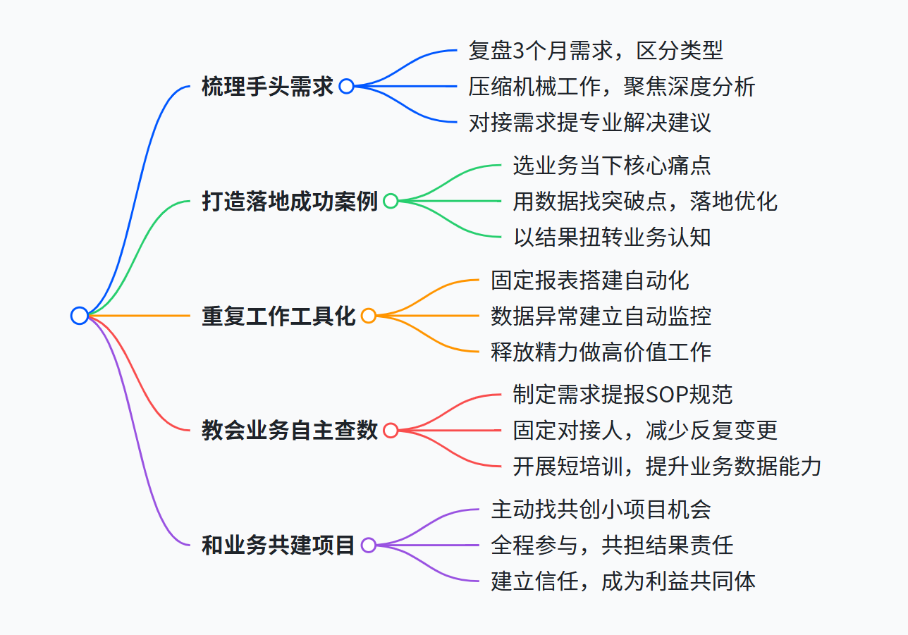 还有你对接需求的时候,别只按要求来,要提专业建议。比如业务要销售数据,不光给数字,还要说清哪款卖得好、哪个渠道效率低、该怎么调整,能解决实际问题,业务才会重视你。