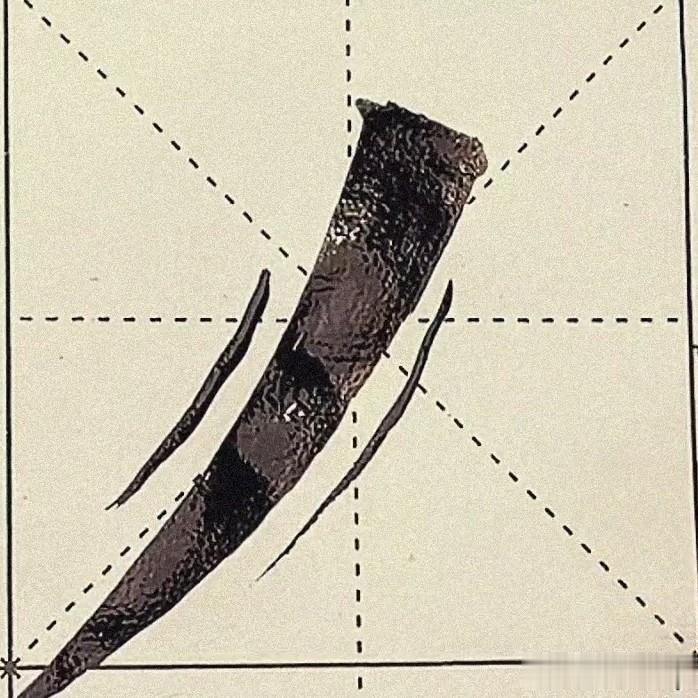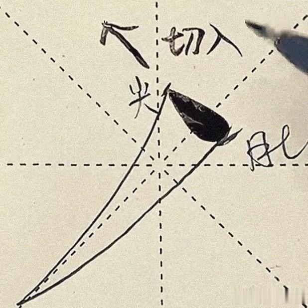 切顶翻着是将笔在十点位为切入纸面,然后提笔向左上顶,笔尖与纸面呈360度,然后向左下行笔出锋。当笔切入之后,往左下行,然后捻转处于中锋的位置,向左下出锋。自然出锋是当笔切入之后,不需要多余的动作,直接向左下,行笔出锋。