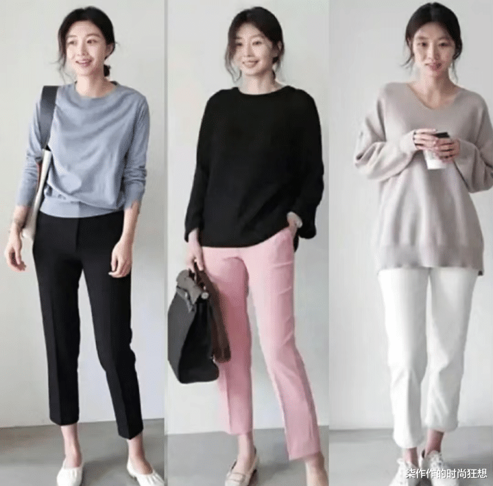 雾霾蓝色的针织衫搭配黑色烟管裤,配色清爽干净,完全没有油腻感,自然就显得人更年轻有活力了。茱萸粉色的烟管裤可以选择黑色为进行搭配,不仅没有甜腻感,反而多了一些清新感,显得特别青春。