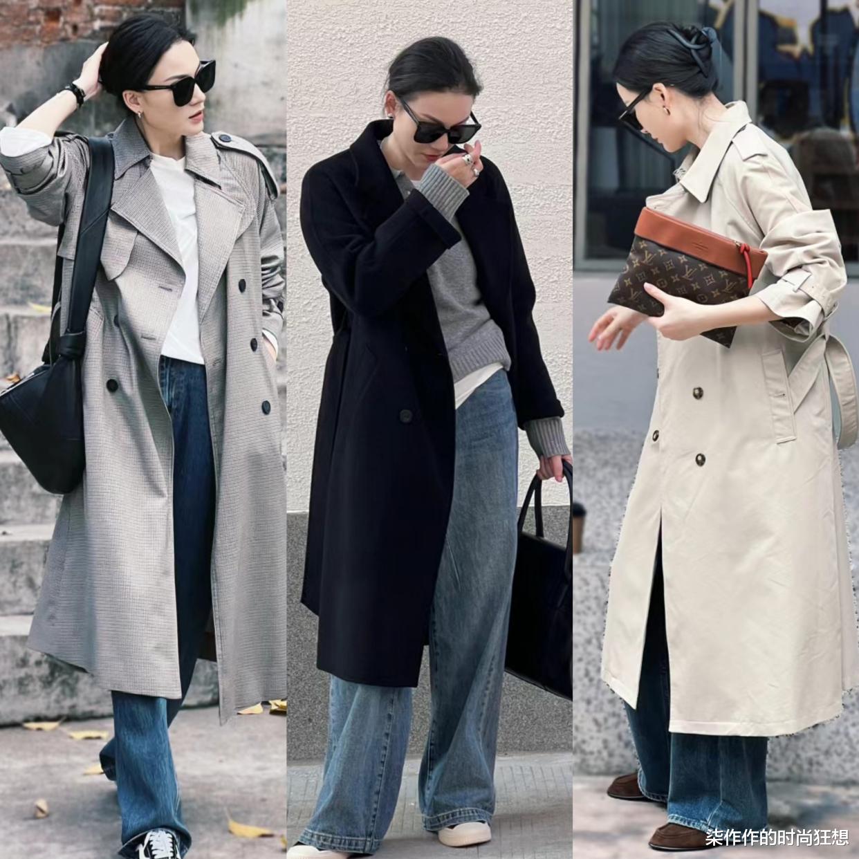 比如灰色的长风衣,可以敞开来穿,里面内搭选择短款的白T来搭配拖地的牛仔阔腿裤,内搭上短下长,分分钟穿出两米八的大长腿来,让身材比例变得更好看,人也显得格外精神。