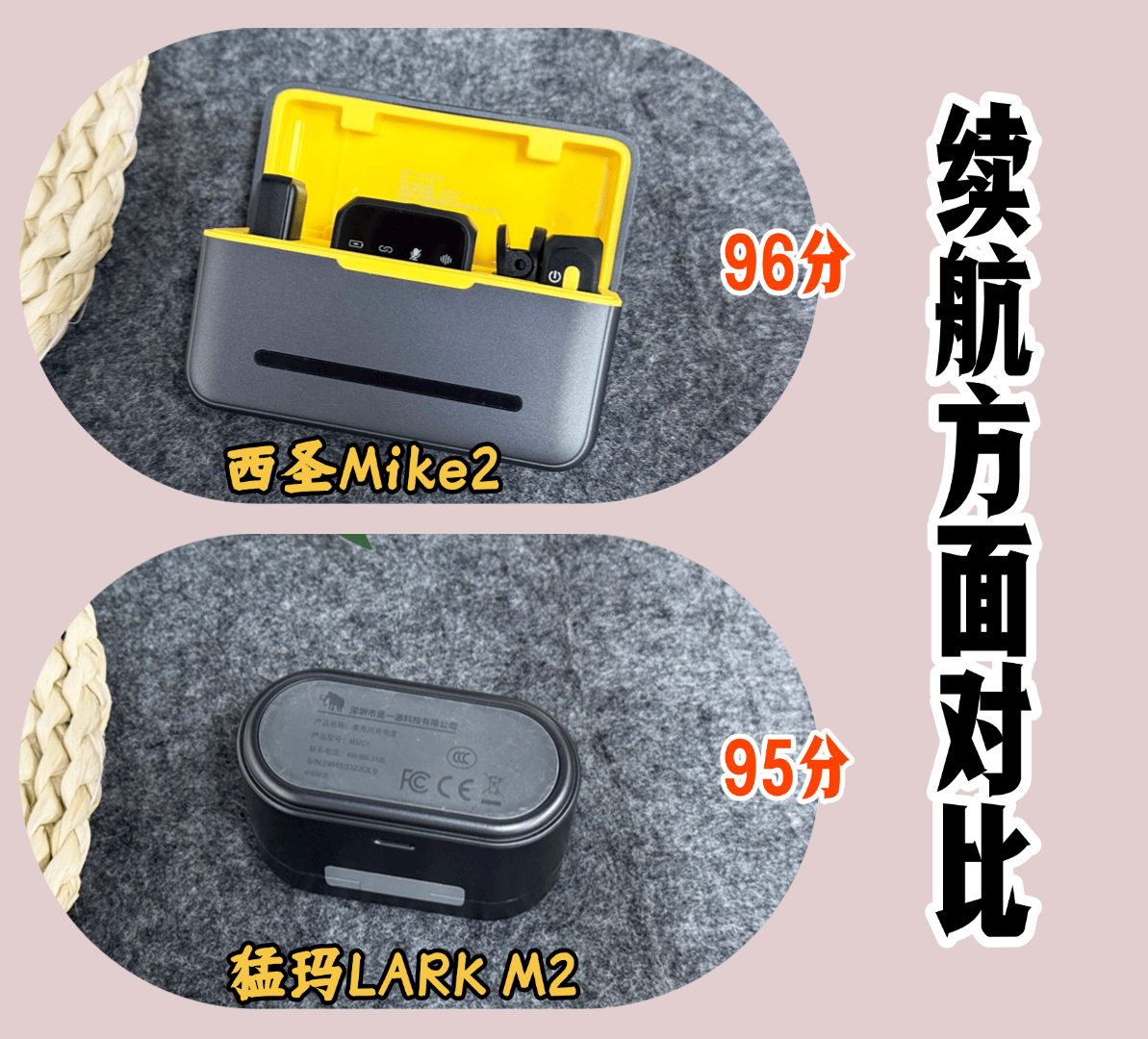 猛玛LARK M2的续航则偏短。单麦克风9小时续航,总续航30小时。若用于全天直播,不过麦克风充电速度较慢,充满需2.5小时,而西圣Mike2充满仅1.5小时,应急场景下灵活性不足。