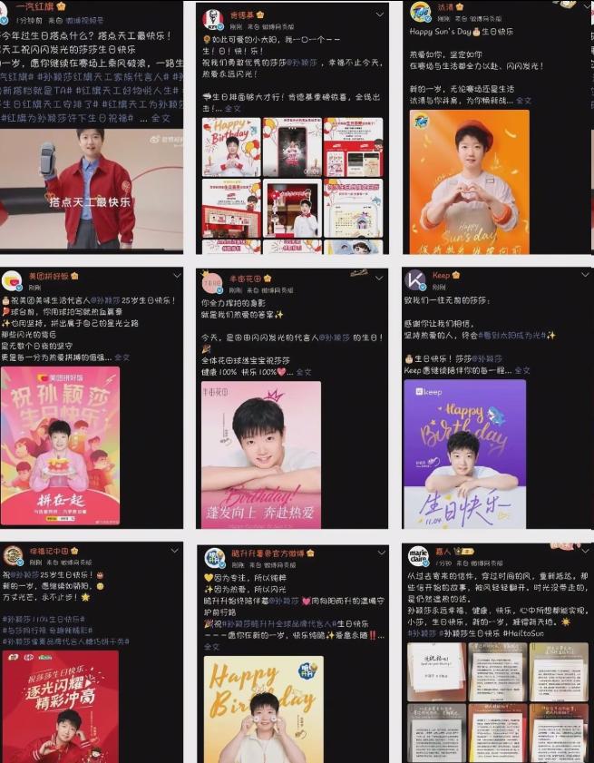 在她生日这天,代言的商家们也不甘示弱,纷纷在零点为莎莎送上了祝福。