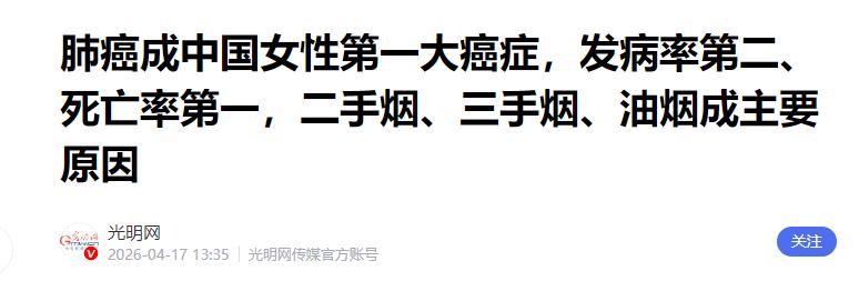 光明网《肺癌成中国女性第一大癌症,发病率第二、死亡率第一,二手烟、三手烟、油烟成主要原因》