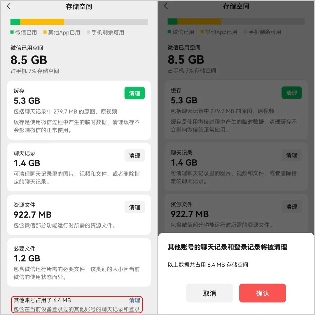 1、可清理登陆过的其他账号记录在微信“我-设置-通用-存储空间”中,界面最底部新增了“其他账号”的清理功能。