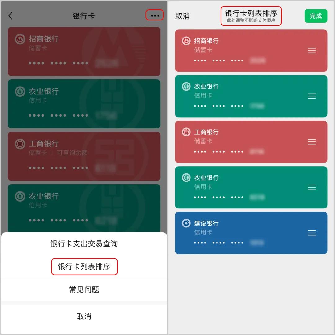 在微信“我-服务-钱包-银行卡”中,点击界面右上角“···”后,功能选项中新增了“银行卡列表排序”。