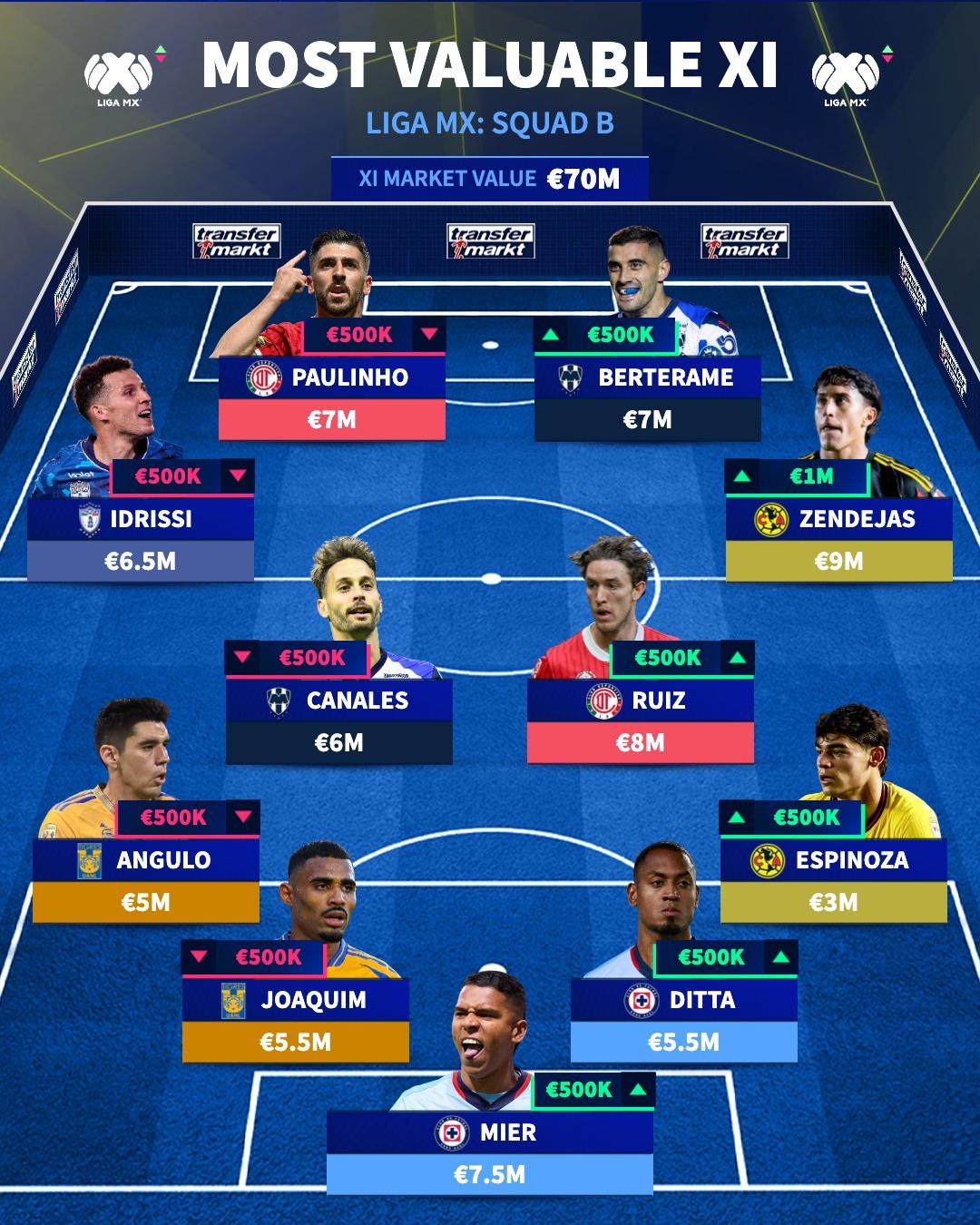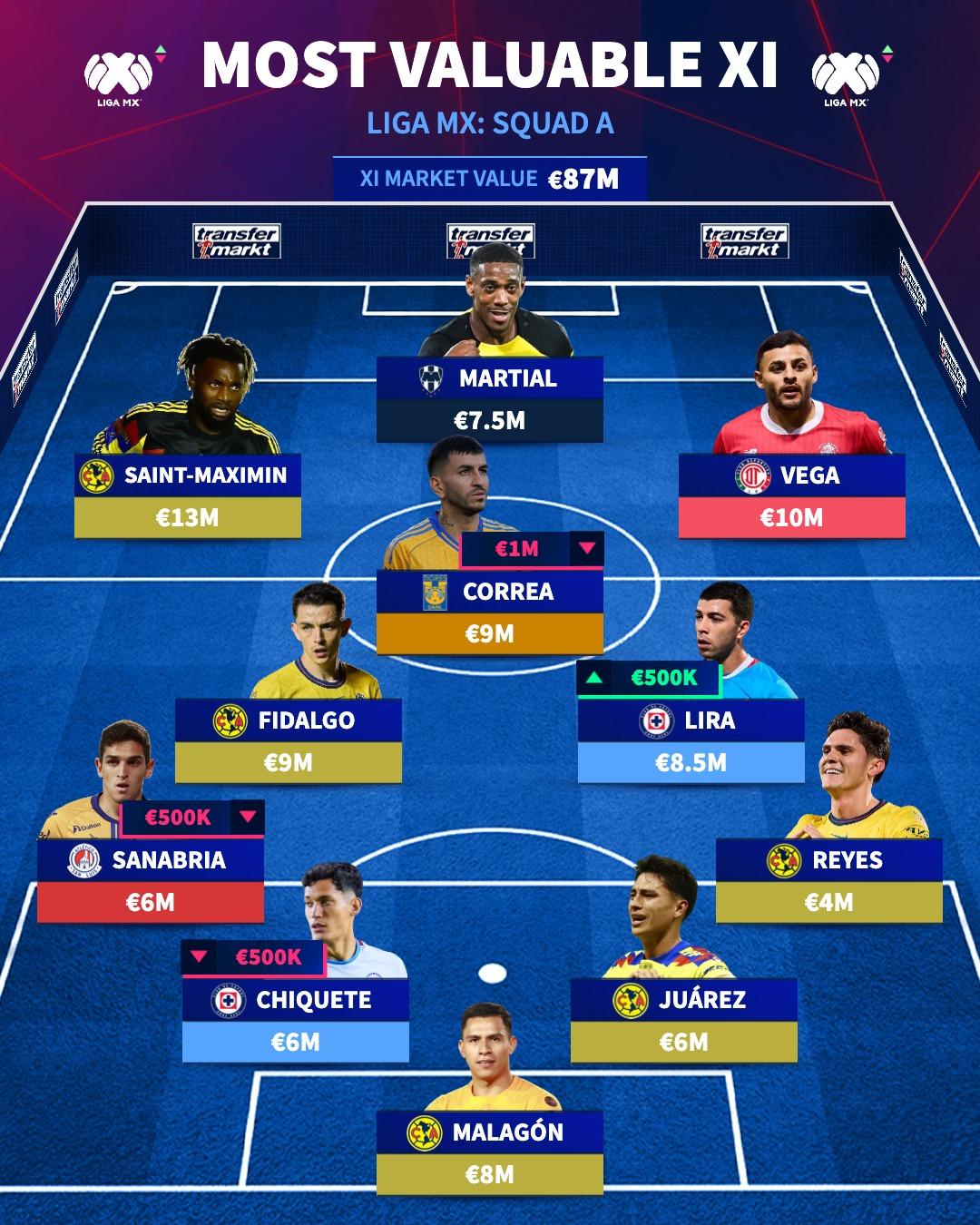 虎扑09月23日讯更新身价后,德转评选出了墨西哥联赛目前身价最高的两套阵容。