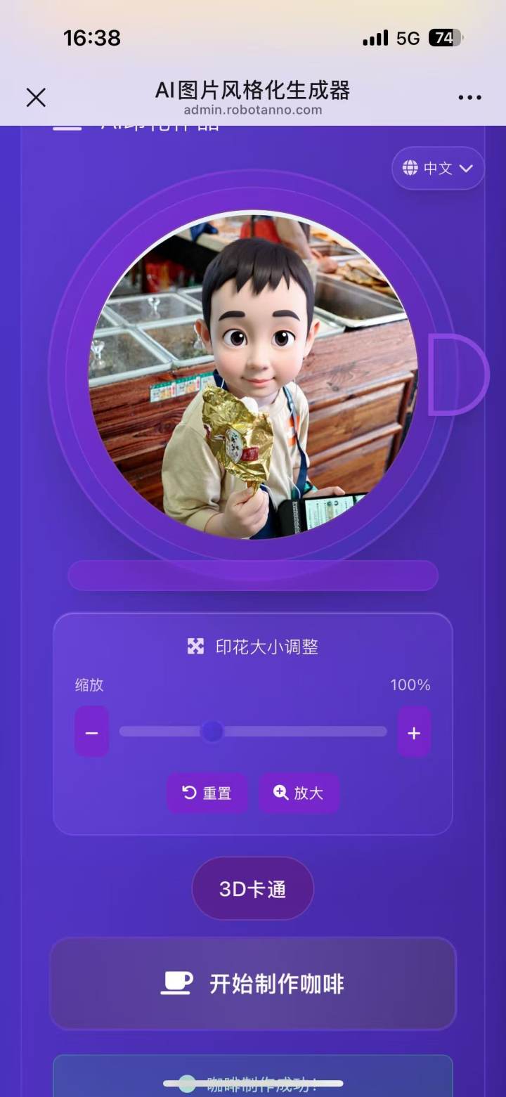 扫一扫咖啡机屏幕上的二维码,在手机上挑选自己喜欢的AI印花风格(动漫风格、3D卡通、写实风格等),并上传一张你喜欢的照片,系统就会自动生成一张独属于你的图片。支付下单后,咖啡机器人会制作一杯印有你照片的咖啡。整个过程只要两三分钟。