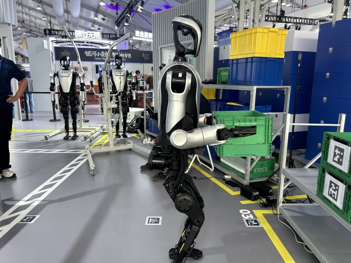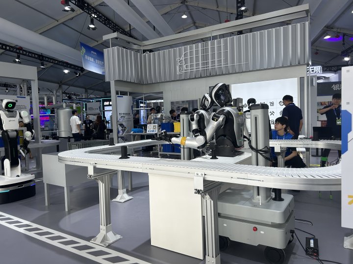 一个人形机器人轻松地搬起箱子,转身走到模拟生产线旁边,并把箱子放到了生产线上。附近的另外一条模拟生产线上,两个“打工”的机器人正在卖力地分拣和质检。