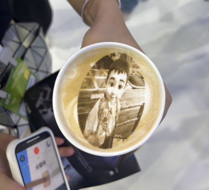 工作人员介绍说,这是由阿里云联合安诺机器人推出的创意咖工坊,在咖啡机器人的基础上,加入了云计算的AI生图功能,就可以用AI定制一杯专属咖啡印花,让喝咖啡变得非常有趣。