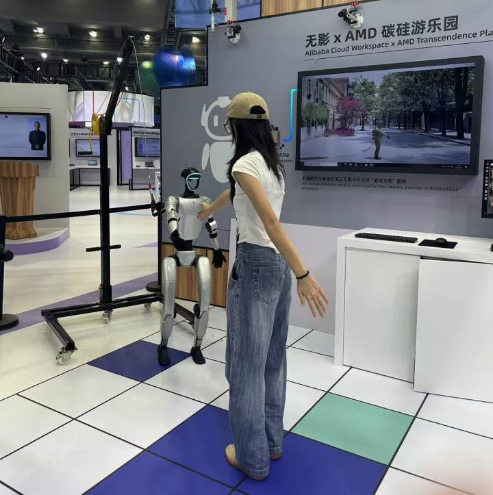 在碳硅游乐园,站在指定的区域,对着机器人挥挥手,站你对面的机器人也模仿你的动作,朝你挥挥手;当你对着它比心,它也同步给你比个心,甚至能做到实时同步。
