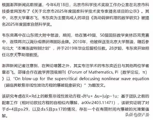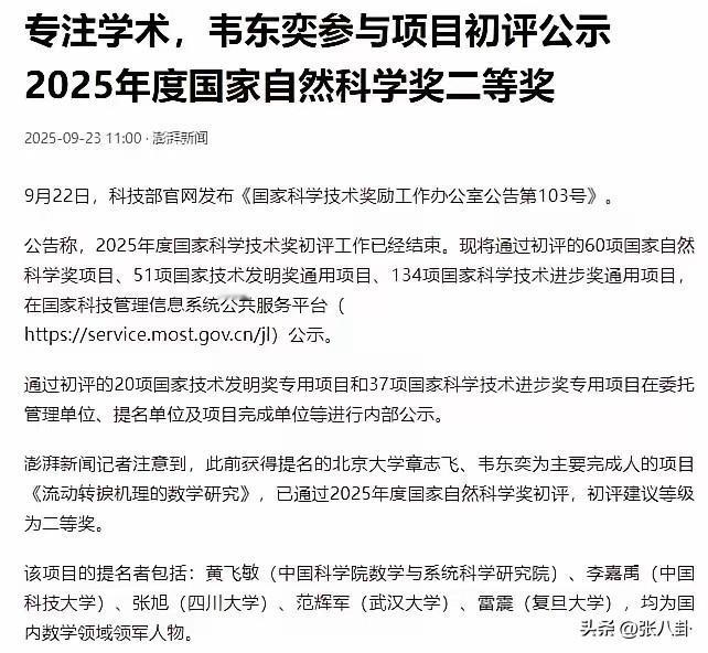 韦东奕获奖,可能真要变天了。 你们注意到没有,北大“韦神”韦东奕参与的项目,刚通过国家自然科学奖的初评。这事不一般。他今年才33岁,在北大还是个助理研究员,连副教授的头衔都没有。在中国,这个年纪、这个职称,能摸到这种级别奖项的边,以前想都不敢想。 这个项目名字叫《流动转捩机理的数学研究》。听起来很深奥。简单说,就是研究流体是怎么从平稳流动变成湍流的。这是物理学和工程领域里一个非常基础又棘手的大难题。 看看往常的获奖者就明白了。过去十年,拿这个奖的人平均年龄52岁。十个里面有九个是院长、主任,头顶各种光环。韦东奕呢?他什么行政职务都没有,就是个一心扑在数学上的人。 这说明什么?说明评审的标准可能真的开始变了。有科技部的人私下说,这次他们更看重项目本身的价值,不是先看申报人官有多大、帽子有多高。 这其实就是教育部一直在推的“破五唯”。不看论文数量,不看职称高低,不看帽子头衔,就看你的成果硬不硬。和韦东奕一起被提名的,还有清华姚班出来的一些90后科学家。年轻人开始冒头了。 提名韦东奕的专家阵容,也很有说服力。五位推荐人全是数学界的大佬,包括中科院的院士。这些前辈愿意为一个没有任何“帽子”的年轻人站台,信号已经很明确了。就像另一个获奖的燕山大学团队,里面一个长江学者都没有,全靠实实在在的材料性能拿奖。 这件事给无数默默做研究的年轻人带来了希望。以后评奖,也许不用先去熬资历、拼关系。只要你的东西足够好,就有机会被看见。这个变化,比建多少大楼都重要。因为再厉害的天才,也怕被论资排辈的老规矩埋没。 科研评价这根指挥棒,看来是真的要转向了。 对此你怎么看? 韦东奕 (图片素材来源网络)