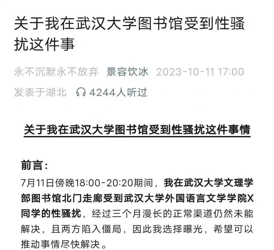 曾掀起舆论波澜的武汉大学图书馆事件,终于迎来关键转折。9月17日,武汉市中级人民法院二审宣判,驳回女生杨某媛对男生肖某瑫的性骚扰指控,维持一审原判。20日,武大迅速响应,通报表示尊重司法判决,经调查复核,果断撤销先前给予肖某瑫的记过处分,力求让事件处理重回公正正轨,也给公众一个清晰交代 。