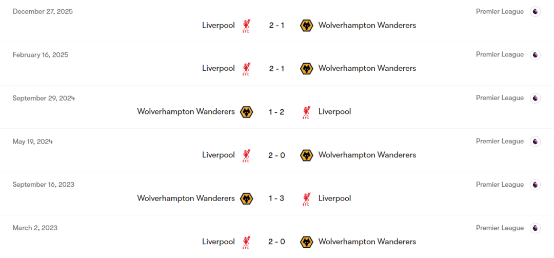 利物浦与狼队的英超交锋史堪称一边倒,红军在英超时代对阵狼队的胜率高达83%,这一数据是英超史上同一对手20 +交锋中的最高胜率。近18次英超对决,利物浦豪取17胜1负,仅在2023年2月客场0-3爆冷失利,其余场次均能顺利拿下。本赛季首回合,利物浦主场2-1小胜狼队,当时红军在中场伤病困扰的情况下,仍凭借赫拉芬贝赫和维尔茨的赛季首球锁定胜局。