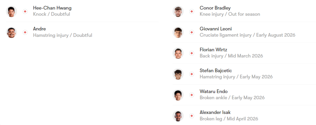 利物浦目前遭遇伤病危机,维尔茨、远藤航、伊萨克等球员伤缺,中前场攻防转换能力受到一定影响,但球队后防依然稳固,近4场比赛仅失2球。锋线端,埃基蒂克贡献11球4助,加克波在上轮打破进球荒后状态回升。