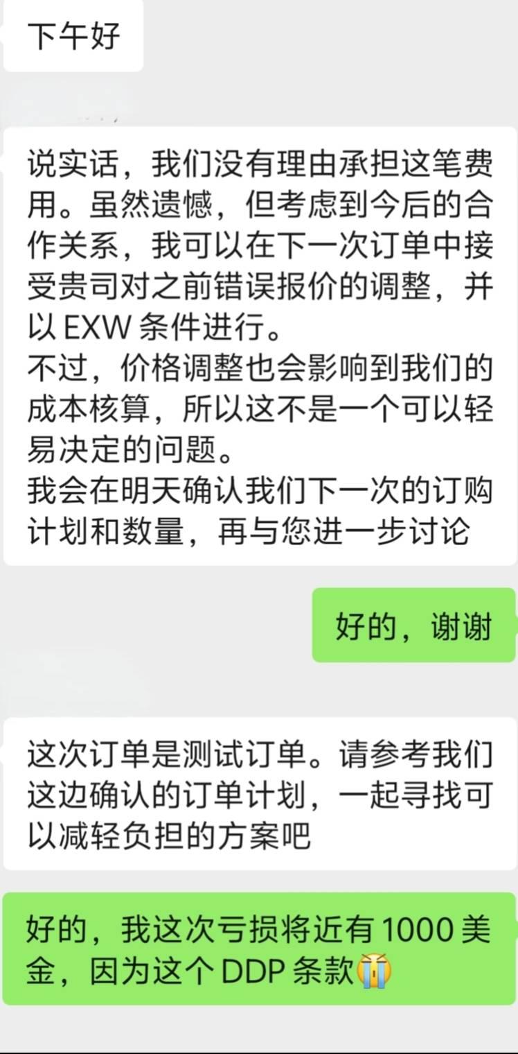 做了这么多年的外贸,没想到第一次做DDP,亏了将近1000美金! 在阿里上一个韩国的小客户要求我做DDP,本来之前算好利润还是可以的,但没想到客户后面临时加了要求,要求每个产品独立包装,价格我也按照实际成本加上去了,工厂说这种独立包装体积可能会增加20%左右,我也是按照增加20%左右的成本去算。 但是等工厂做好,体积直接增加了200%,我和工厂说你这不是开玩笑吗?体积增加20%变成增加200%?于是我就让他使劲压缩,但最极限地压缩,体积还是增加了100%,直接导致我的DDP费用增加了700美金。 然后等我要准备订舱报关了,货代又来一个要求每个产品+外箱必须贴上MADE IN CHINA的标签,不然韩国海关要罚款。工厂是非常不愿意返工的,因为产品小,数量多,但是不返工货发不了,只能全部返工,这返工成本就是2000元,接近300美金,只能我来掏钱了。 好了,这样一算1000美金就损失了,想让客户给我加点DDP的费用,但是客户不愿意,说为了以后的合作,后面的订单再加上成本,我也没办法,只能咬碎牙往肚子里咽。 其实这也不怪别人,只能怪我自己太大意了,虽然第一次做DDP吃了亏,但是以后再碰到要求做DDP的客户,我就得先把所有的体积重量仔细核算清楚,包括货代那边有什么要求先仔细问清楚,再报价给客户,不然只能自己承担损失。 没有做过DDP的朋友们,希望也能从我这损失1000美金的代价上吸取经验教训[笑哭][笑哭][笑哭]