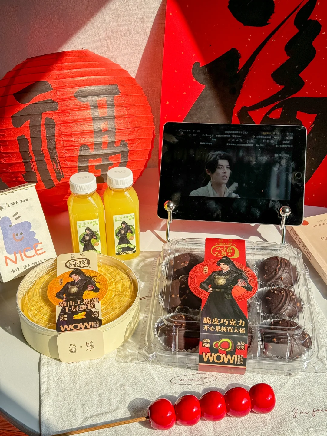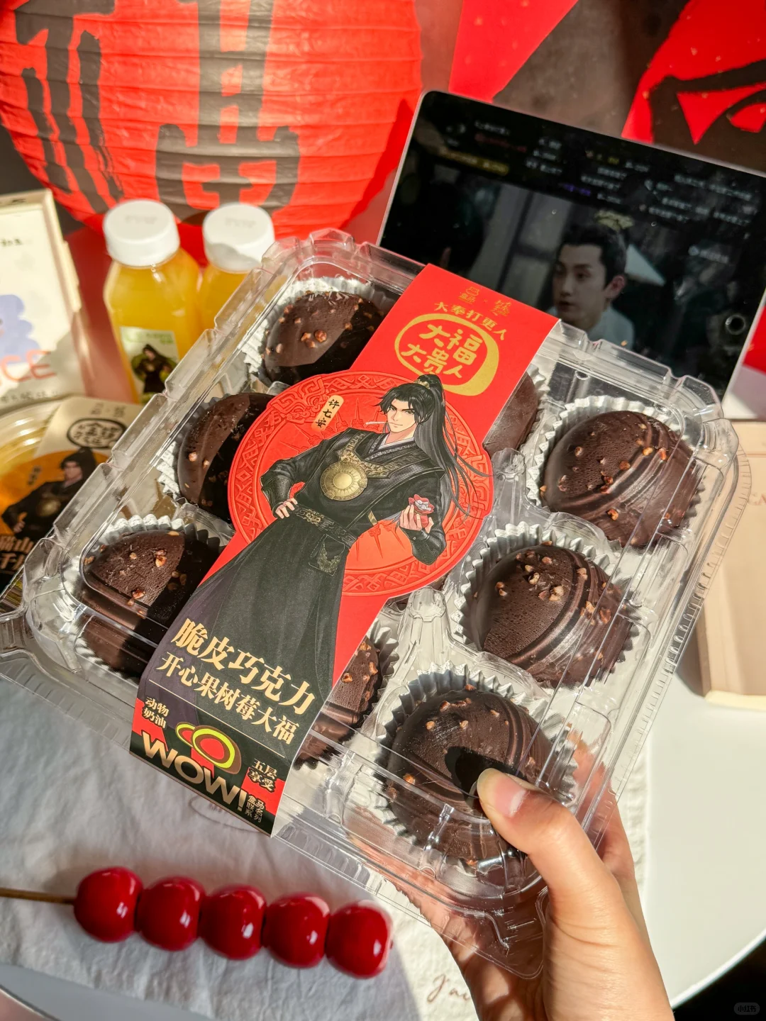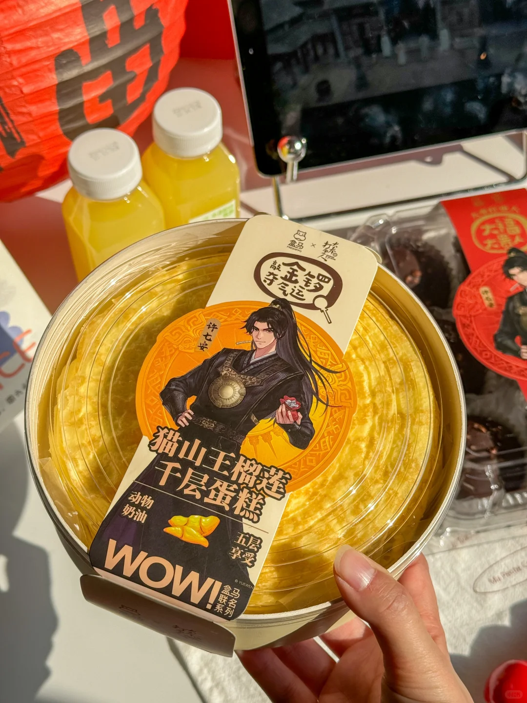 啊啊啊啊盒马你真的太牛了!! 居然和大奉打更人联名了!!! 本剧迷一整个大心动!立刻下楼直奔盒马!!! 联名的包装好好看,害我都舍不得打开来哈哈~ 盒补补红参石榴饮、无核沃柑礼盒、猫山王榴莲千层蛋糕🍰脆皮巧克力开心果树莓大福🍫小青柠汁🍋nfc鲜榨橙汁🍊! 都是我平时回购了好多次的产品!真的很好吃!!! 特别是脆皮巧克力开心果树莓大福!没吃过的一定买 黑巧坚果碎脆皮➕生巧大福皮➕开心果奶油➕生巧➕树莓果酱吃起来酸酸甜甜的,一点都不腻哦~ 大奉打更热,大福大贵人,这个文案也绝了哈哈