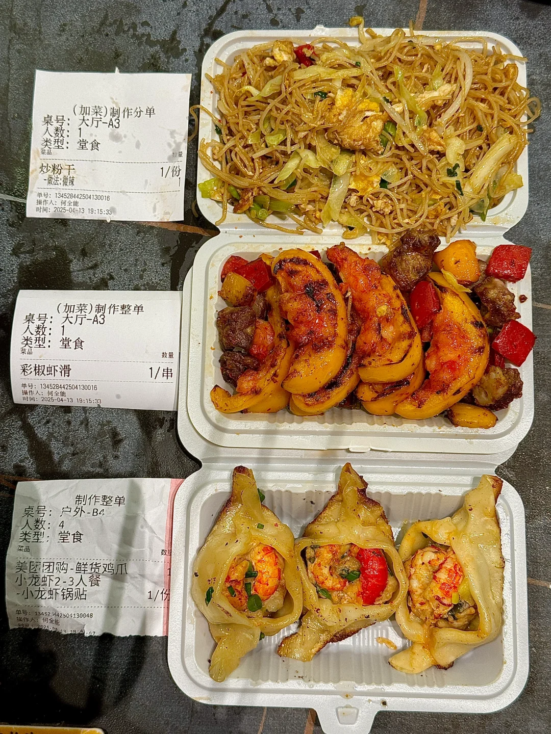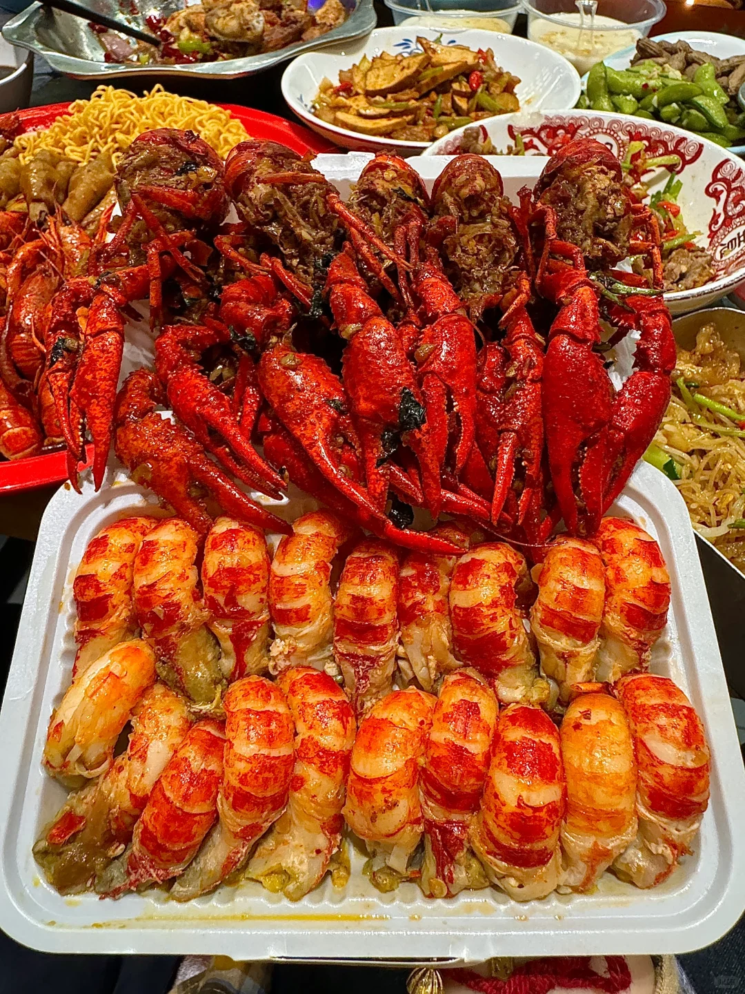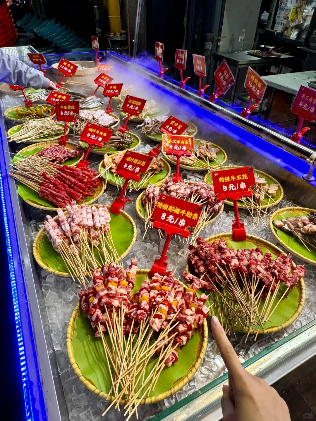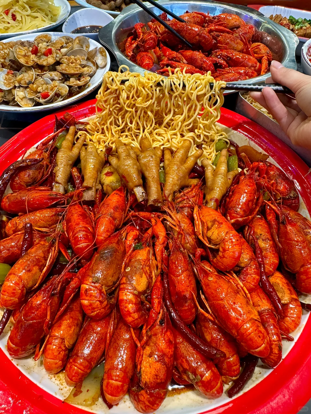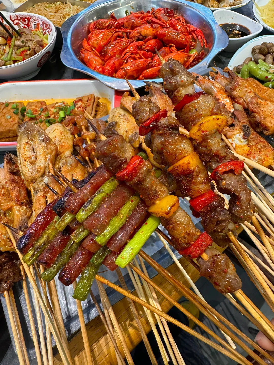 余杭!我的宝藏夜宵大排档就是他家!!!! 营业到凌晨3点!生意真的好的不得了。。。。 强推小龙虾和烧烤🍖鲜货鸡爪龙虾里面再加一份泡面🍜小龙虾的个头大很新鲜!味道也贼拉好!!! 各种小烧烤都是当天现串,肉质都很好!我们点了牛五花趾、彩椒牛肋条、青椒虾滑、嫩汁牛肉串、黄金牛油小串、烤甜虾!趁热吃都恨美味🤤!! 店里还有很多烟火气很足的小炒江湖菜也很下酒!